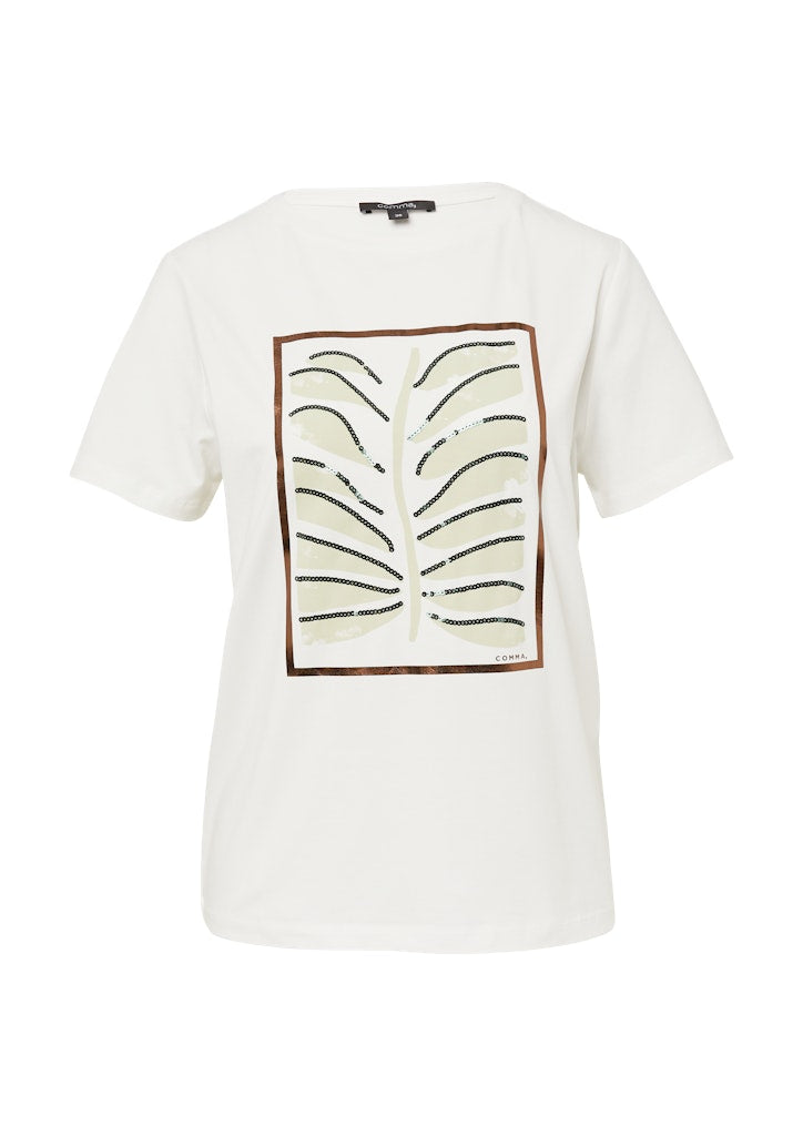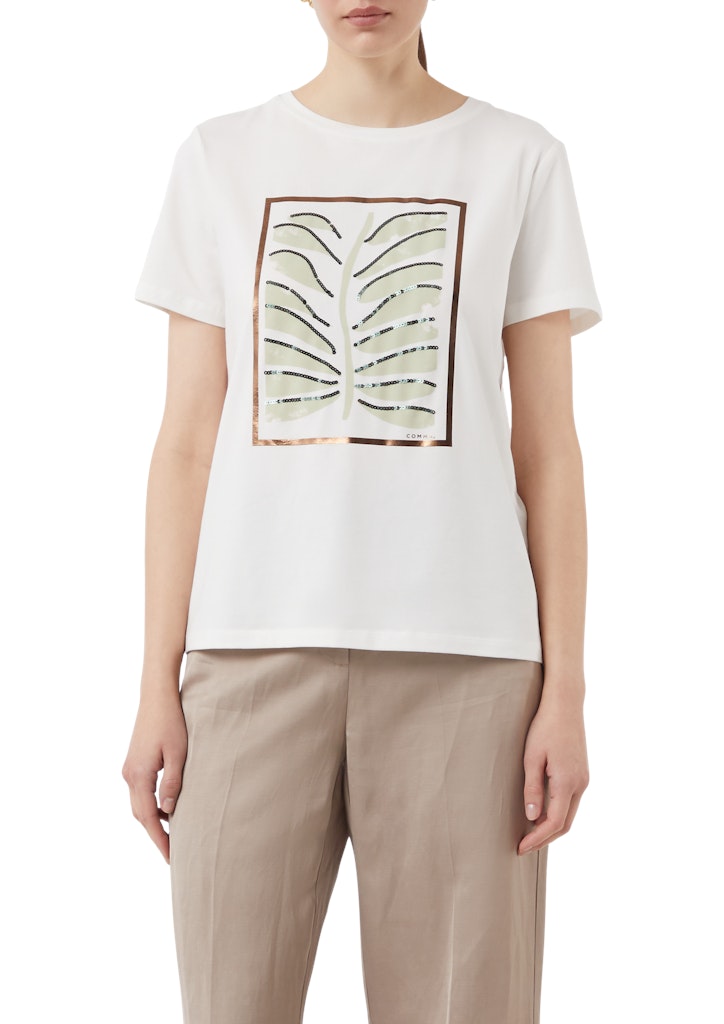 Setzen Sie auf lässige Eleganz mit diesem Jersey-T-Shirt im Regular Fit. Der Rundhalsausschnitt und der Frontprint mit Pailletten-Details verleihen dem Casual-Piece eine modische Note. Aus einem hochwertigen Baumwollmix gefertigt, bietet es Ihnen optimalen Tragekomfort für den Alltag. Kombinieren Sie es vielseitig zu Jeans oder Rock für einen stilvollen Look.