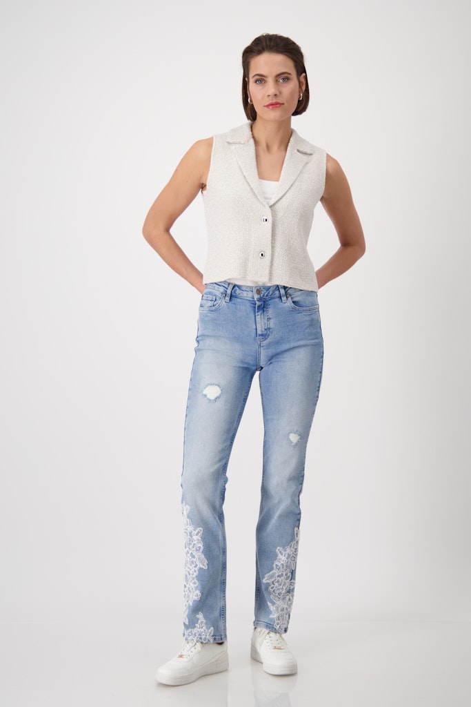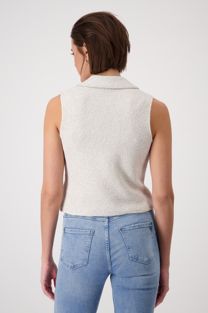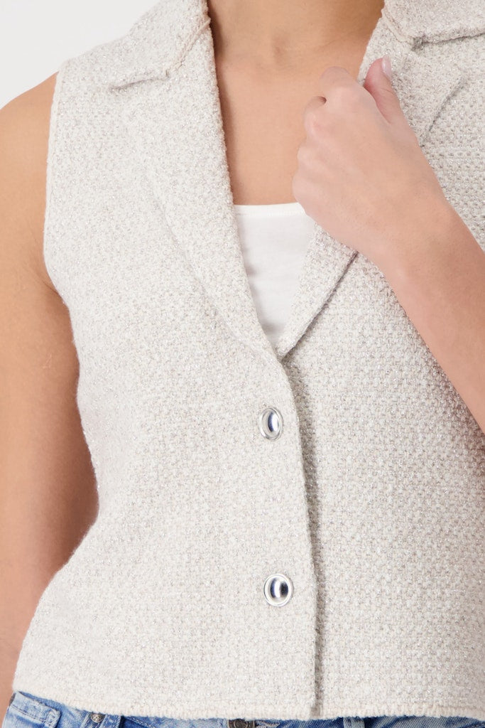 Diese luxuriöse Strickweste besticht durch ihren eleganten Reverskragen und die funkelnden Lurex-Details.