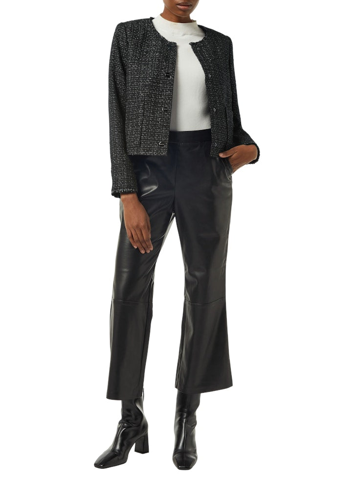 Bringen Sie Ihren Look zum Funkeln mit dieser exquisiten Bouclé-Jacke. Das Glitzergarn verleiht dem Stoff eine subtile Brillanz, während die Fransen-Details für einen Hauch von Extravaganz sorgen. Die aufgesetzten Taschen bieten nicht nur praktischen Nutzen, sondern setzen auch einen stylischen Akzent. Perfekt für den Layering-Look oder als Statement-Piece – diese Jacke ist Ihr neuer Favorit für jede Gelegenheit.