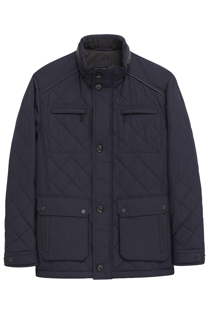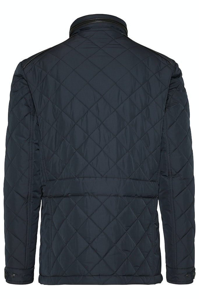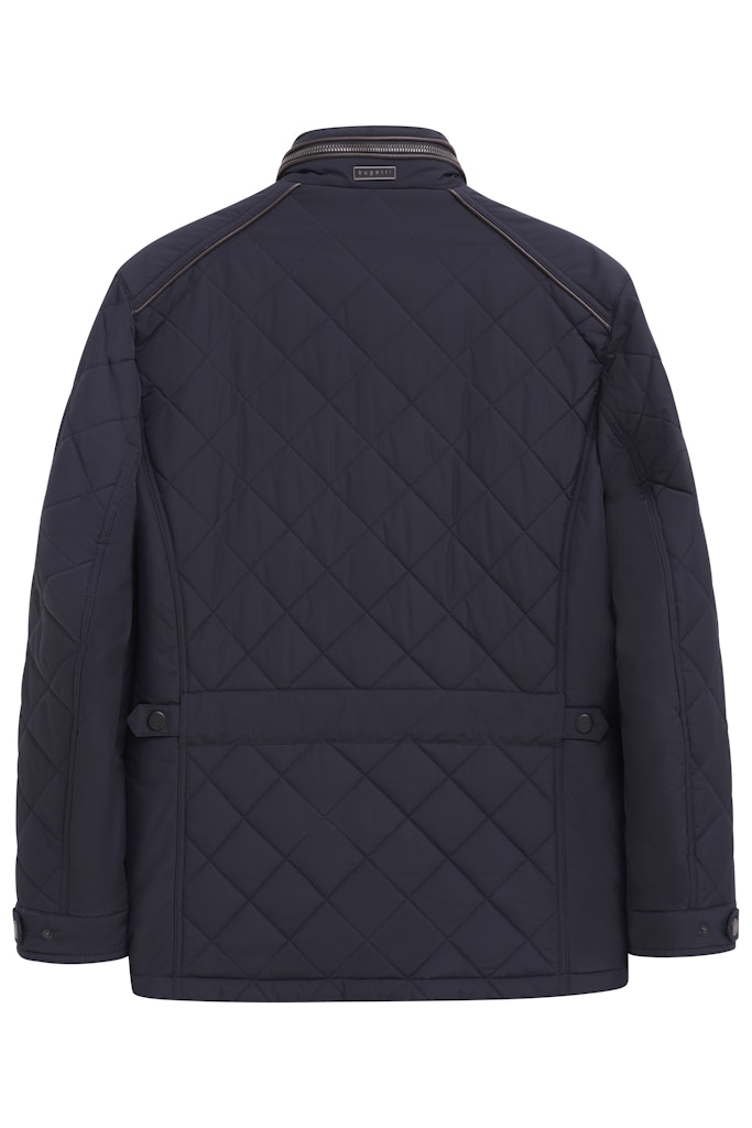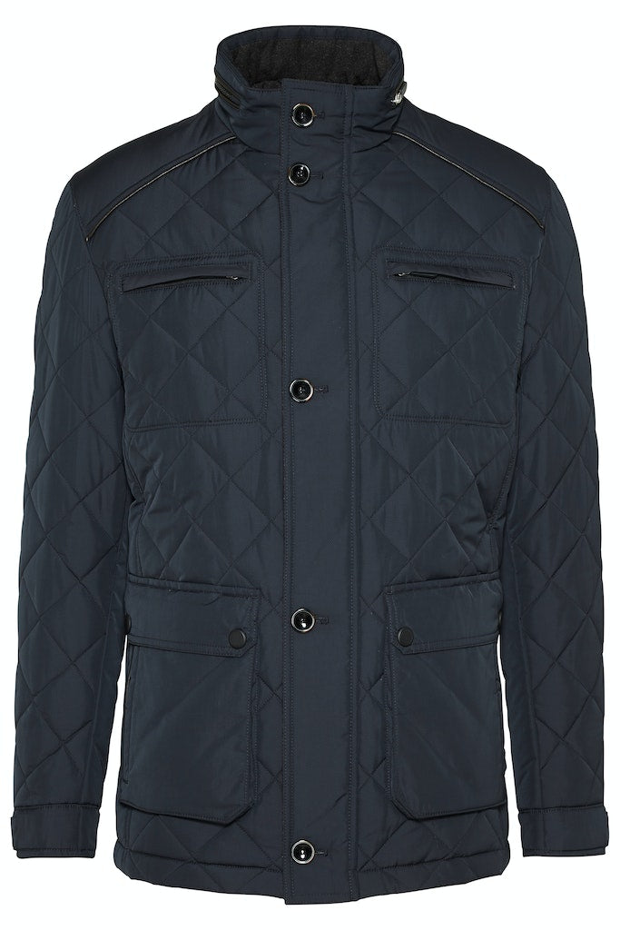 Ganzjahres Männerjacke im Rautenstepp mit Stehkragen, Schulterpasse und aufgesetzten Pattentaschen sowie zwei Brusttaschen mit Reißverschluss. Kunstlederkontrast am Kragen, den Schulterpassen und den Seitentaschen. Innen ist die Jacke ganz gefüttert. Flanellkontraste durch den Etikettenträger, die Innentaschen sowie am Besatz. Der Artikel überzeugt mit seiner wasserabweisenden Ausrüstung und seiner Struktur.