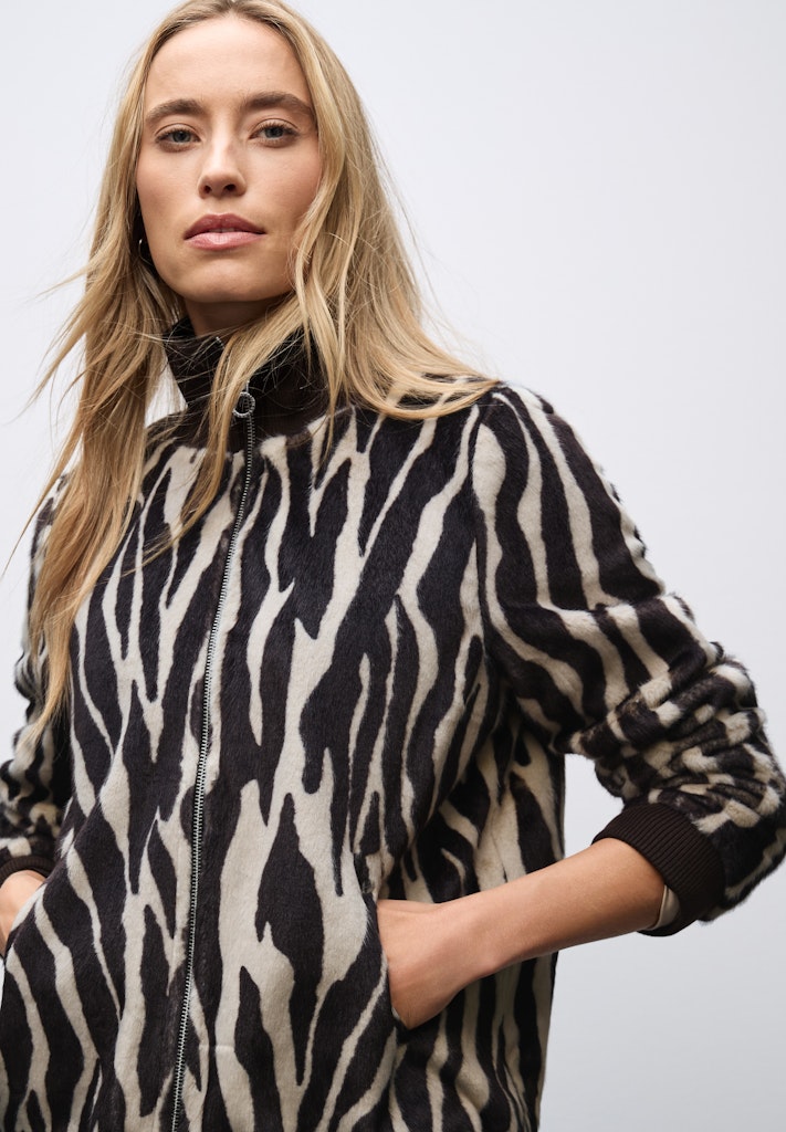 Mit dem Fake Fur Blouson von Street One für Damen setzt du ein echtes Statement. Die weiche Kunstfellqualität im angesagten Zebra-Print sorgt für einen auffälligen Look, während Stehkragen, Tunnelzug und seitliche Taschen das Design funktional abrunden. Perfekt für trendstarke Outfits mit Wohlfühlfaktor. Damenjacke Stehkragen Seitliche Taschen Tunnelzug am Saum Weiche Fake Fur Qualität mit Animal Print Material: Obermaterial: 100% Polyester; Futter: 100% Polyester