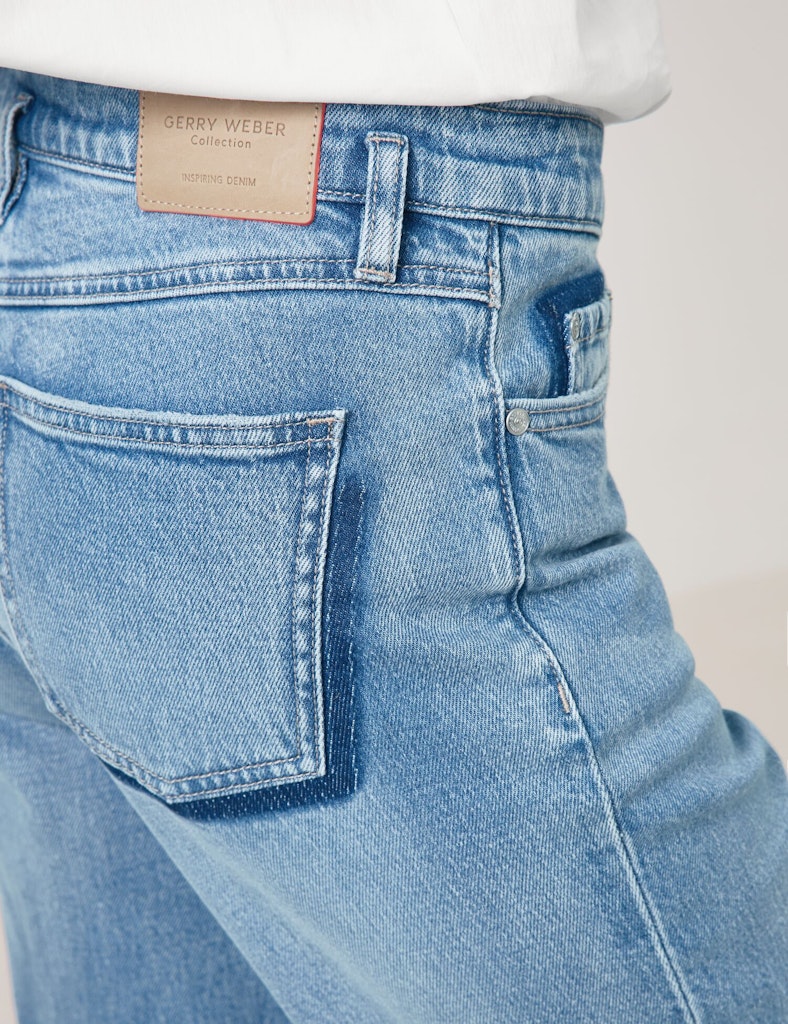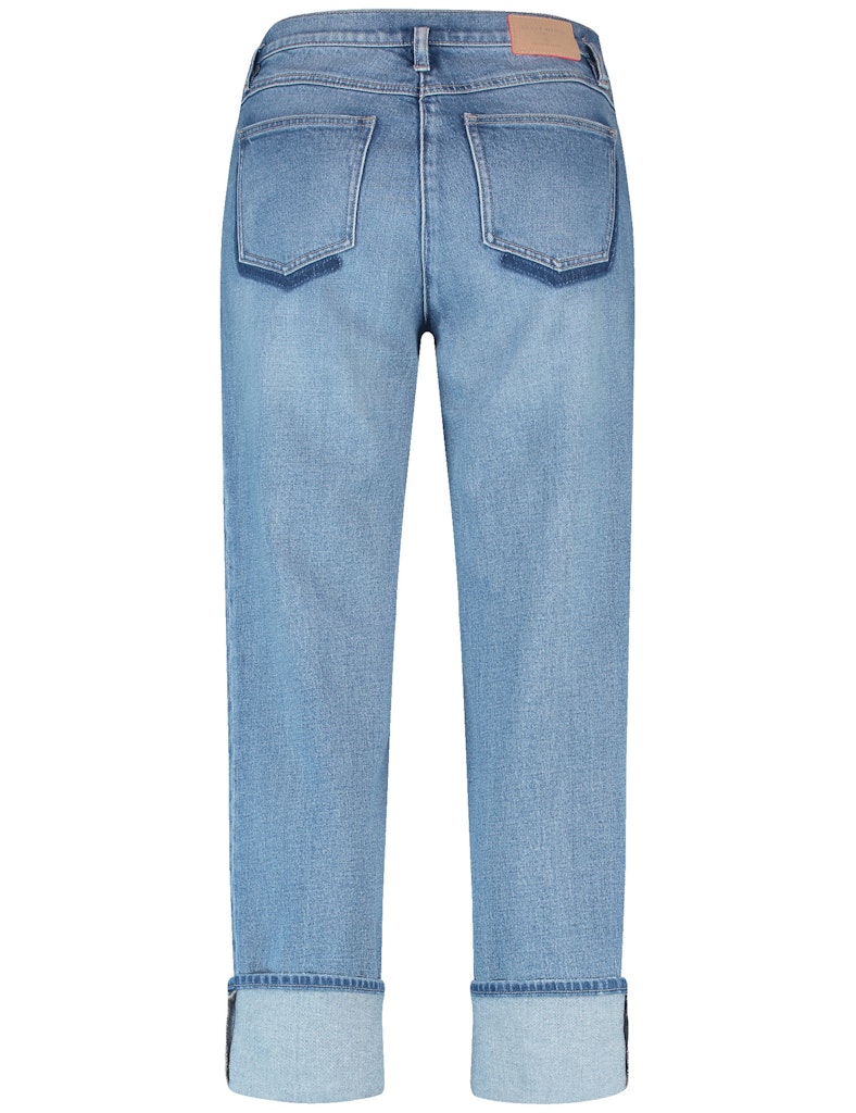 Bund mit Gürtelschlaufen und Logolabel. Angesetzte Sattelpasse. Setze ein Fashion-Statement mit unseren 7/8-Jeans aus elastischem Denim! Der breite Saumaufschlag sorgt für einen trendigen Akzent, während der Stretchkomfort für ein angenehmes Tragegefühl sorgt. Perfekt für stylische Alltagslooks oder raffinierte Kombinationen – diese Jeans vereinen modernen Chic mit unschlagbarer Bequemlichkeit. Ein echtes Highlight für deine Garderobe!