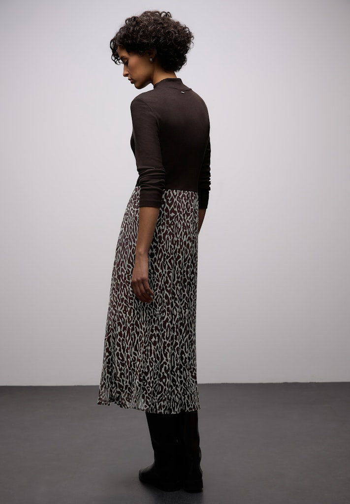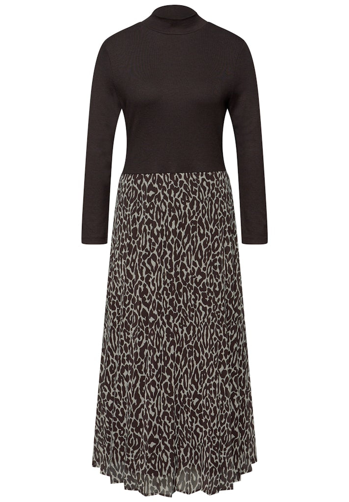 Dieses Kleid von Street One für Damen kombiniert ein fein geripptes Jersey‑Oberteil in Unifarbe mit einem femininen Plissée‑Rock im Leo‑Muster – modern und stilvoll. Das Kleid lässt sich angenehm tragen und modisch stylen. Die bequeme Passform und der auffällige Animal Print machen das Kleid zum Hingucker in deiner Garderobe. Midi-Kleid mit Plissée-Rock Casual Turtleneck Langarm Weich fallend Material: Oberteil: 97% Viskose, 3% Elasthan; Rock: 100% Polyester; Unterrock: 100% Viskose