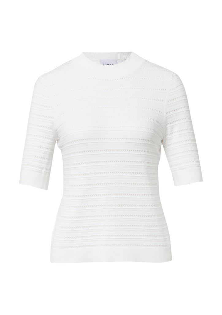 Strukturierter Feinstrickpullover mit Slim Fit-Silhouette und Stehkragen. Kurzarm mit Rippbündchen und Rippblende am Saum sorgen für einen modernen Look. Das feine Strukturmuster verleiht dem Pullover eine subtile Textur. Kombinieren Sie ihn mit einer Jeans für einen lässig-eleganten Alltags-Look oder stylen Sie ihn mit einer Blazer für einen Business-Casual-Auftritt.