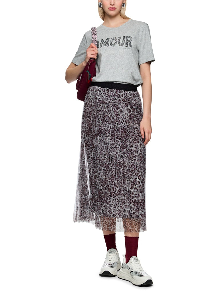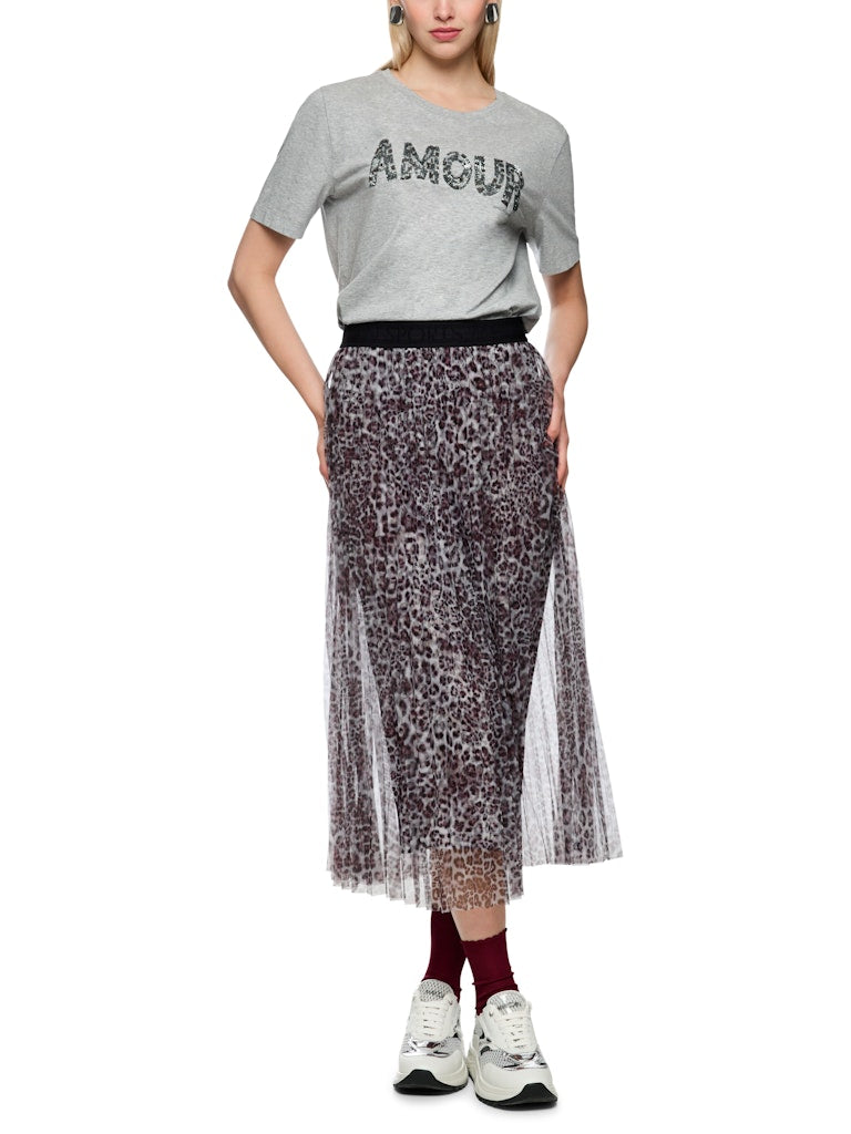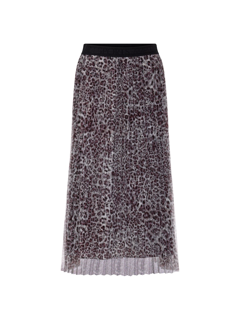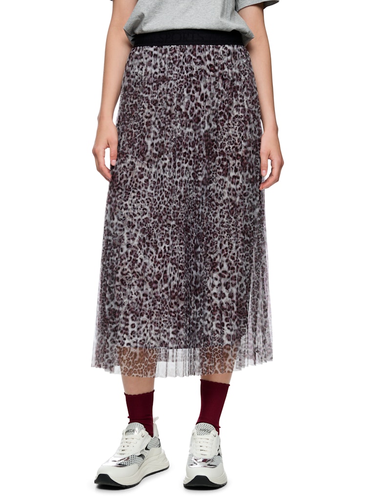 Eleganter Midirock mit Plissee-Falten und modernem all-over Leomuster. Der Rock ist weit ausgestellt und fällt daher schön locker. Der Stoff selbst ist aus einem transparenten Mesh gefertigt und besitzt noch einen zusätzlichen blickdichten Unterrock. Der praktische Gummibund mit Marc Cain Logo sorgt für den perfekten Tragekomfort.