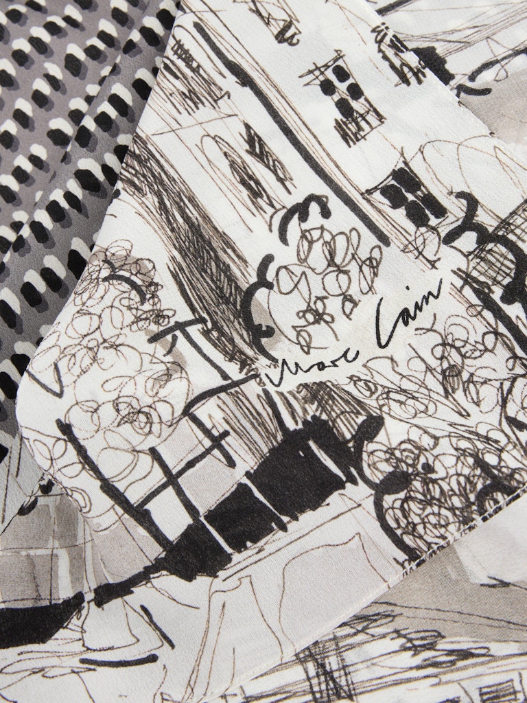 Länglich geschnittener Schal aus reiner Seide mit exklusivem Print-Mix aus Sprinkles- und City-Motiv in künstlerischer Optik. Leicht, edel und vielseitig tragbar – ein stilvolles Accessoire für besondere Looks mit kreativem Twist.