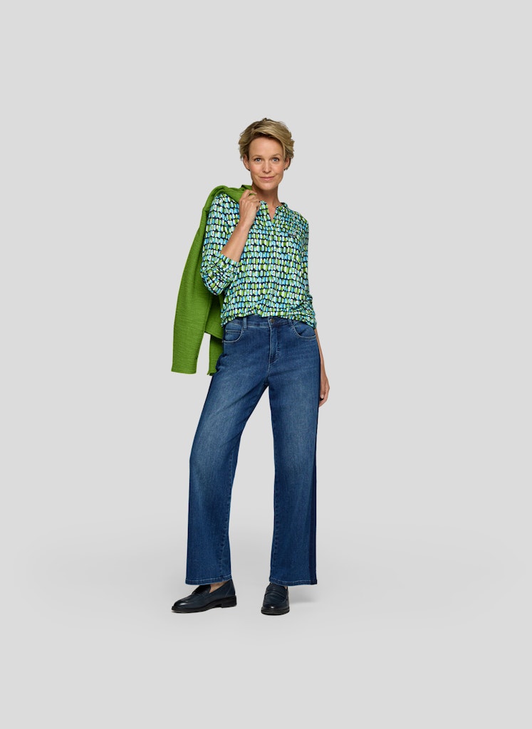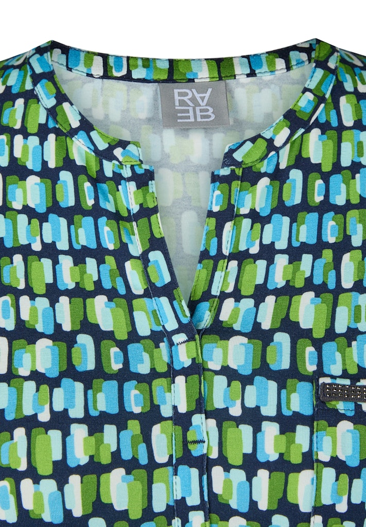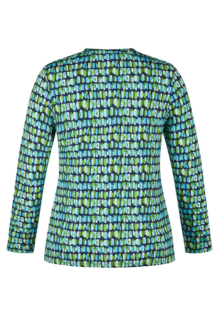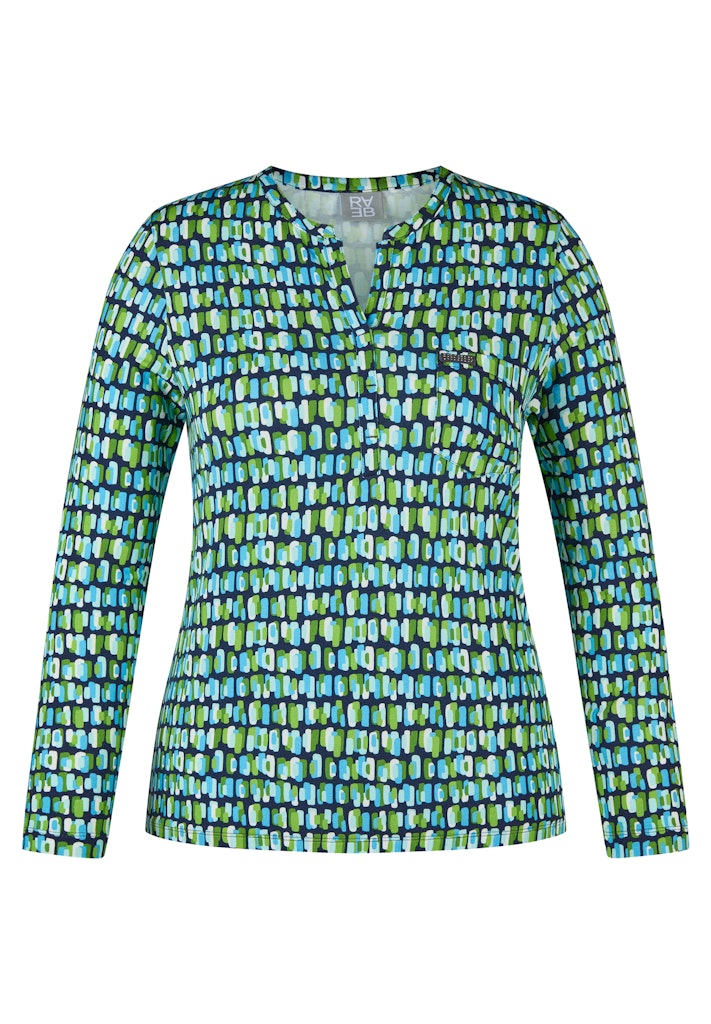 Der weiche Viskosemix sorgt für ein angenehmes Tragegefühl und eine gute Passform. Die geschlossene Schnittführung mit langen Ärmeln macht das Shirt zum vielseitigen Allrounder. Das lebendige Muster bringt Farbe in den Alltag. Ein dezentes Marken-Patch auf Brusthöhe rundet das Design ab. Trageangenehme Jerseyqualität. Elastischer Viskose-Elasthan-Mix. V-Ausschnitt mit schmalem Besatz. Allover mit lebendigem Muster. Marken-Patch auf der Vorderseite.