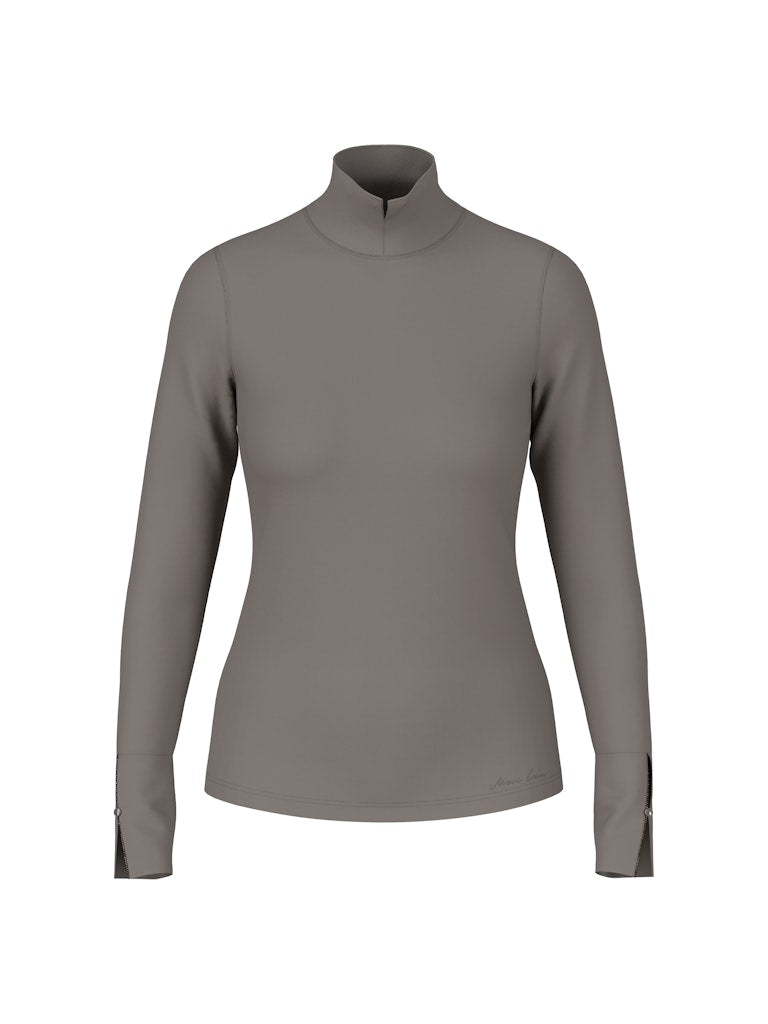 Softes T-Shirt aus Baumwolle mit Elastan. Dieses T-Shirt ist das ideale Basic für kühlere Tage. Es kommt mit Rollkragen und langem Arm. Blickfang ist der schmückende Knopf am geschlitzten Ärmelbund. Die taillierte Silhouette betont die Figur.