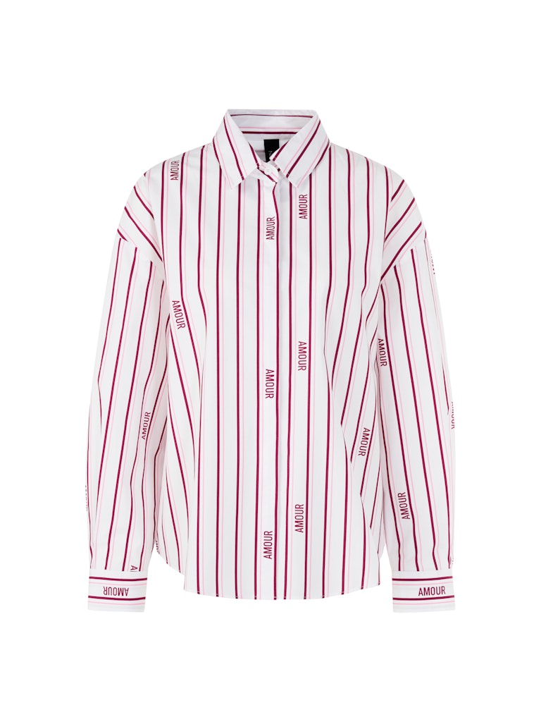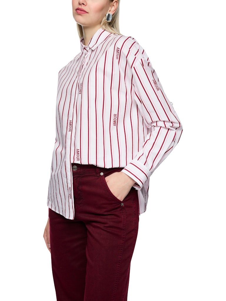 Lässig geschnittene Hemdbluse aus Bio-Baumwolle mit modernen Streifen und Aufschrift. Das Modell ist weitgehend klassisch gearbeitet und hat eine verdeckte Knopfleiste. Die Ärmel sind lang, mit einer kurzen Manschette mit Knöpfung. Das Modell trägt das „Rethink Together“ Label.