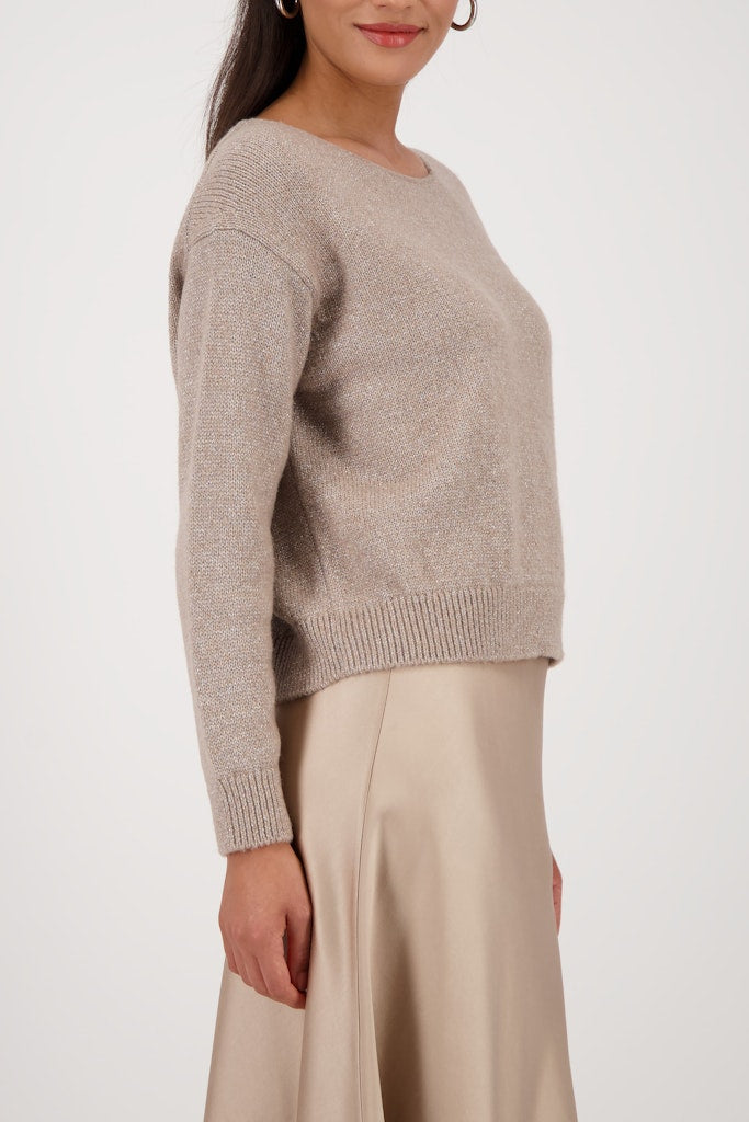 Eleganter Strickpullover aus einer hochwertigen Wollmischung mit glänzendem Lurex, weicher Haptik und leicht überschnittenen Schultern – ein stilvoller Begleiter.