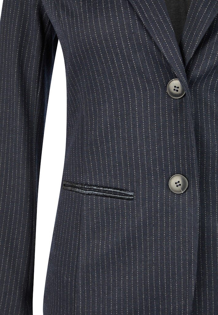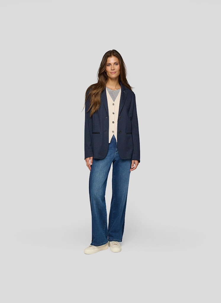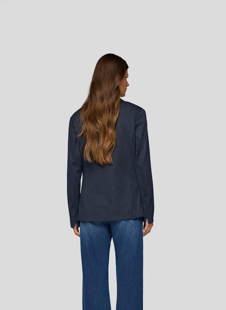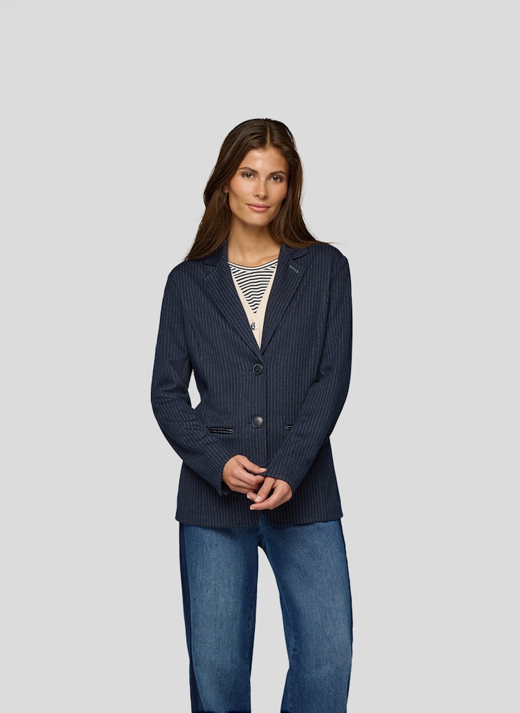 Dieser Blazer setzt auf ein klassisches Nadelstreifen-Design und erhält durch den taillierten Schnitt eine feminine Silhouette. Das Revers und die Zwei-Knopf-Leiste sorgen für einen zeitlosen Stil, während die paspelierten Taschen mit glänzenden Akzenten für einen modischen Twist sorgen. Das elastische Material bietet hohen Tragekomfort und Bewegungsfreiheit.Angenehm leichte Qualität.Schmal geschnitten für eine schöne Form.Lässt sich vielseitig stylen.Ideal für elegante wie legere Outfits.