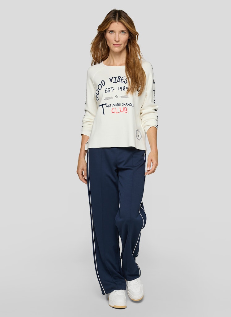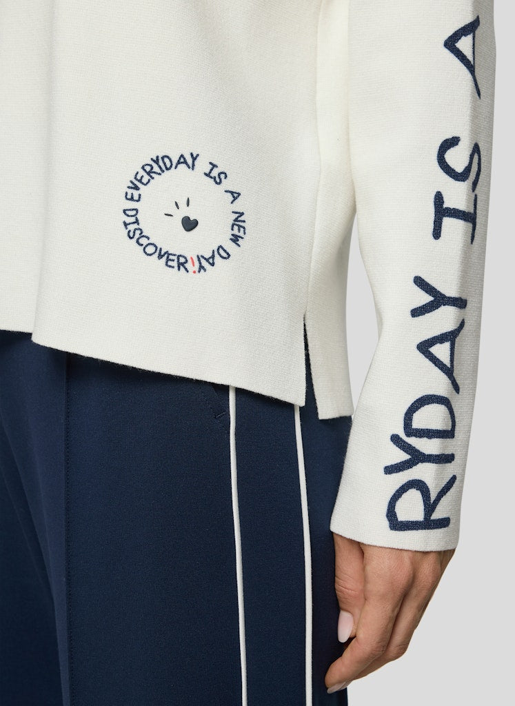 Der moderne Pulloversetzt mit seinem platzierten Frontprint, dem Ärmeltext und dem kleinen Smiley-Detail über dem Saum dezente Statements. Der legere Schnitt mit überschnittenen Schultern sorgt für einen entspannten Look, während die Seitenschlitze Bewegungsfreiheit und einen modischen Akzent bieten. Die weiche Feinstrickqualität liegt angenehm auf der Haut und macht das Modell zum idealen Begleiter für gemütliche Alltagsmomente. Lockerer Schnitt mit Seitenschlitzen. Rundhalsausschnitt mit feinem Bündchen. Platzierter Front- und Ärmelprint. Angenehm weiche Feinstrickqualität.