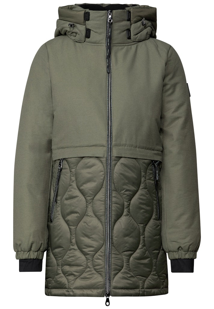 Die Strukturmix-Jacke von Street One für Damen kombiniert Softshell-Stoff im oberen Bereich mit wärmender Steppqualität unten. Die Kapuze mit Tunnelzug schützt zusätzlich, während Zipper-Taschen für Funktionalität sorgen. Eine stylische Übergangsjacke mit spannendem Materialkontrast und hohem Tragekomfort. Damenjacke Kapuze mit Tunnelzug Seitliche Taschen mit Zipper Oberer Teil aus Softshell-Qualität Steppjacke unten Material: Softshell: 73% Baumwolle, 27% Nylon; Obermaterial Steppjacken-Teil: 100% Nylon; Futter: 100% Polyester; Füllung: 100% Polyester