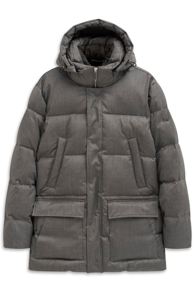 Steppparka mit angeschnittener Kapuze sowie innenliegender Stehkragen und Sorona Füllung. Schräge Leistentaschen in der Brust und aufgesetzte Pattentaschen mit zwei Wege Eingriff als Seitentaschen. Tunnelzug im Rücken und innenliegender Ärmelstulpe. Innen ein ganzes Futter mit Stepp im Rücken. Der Artikel mit Membran hat eine gepflegte Struktur.