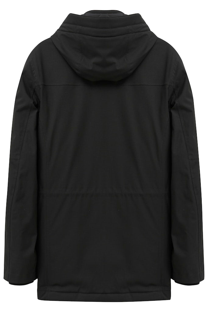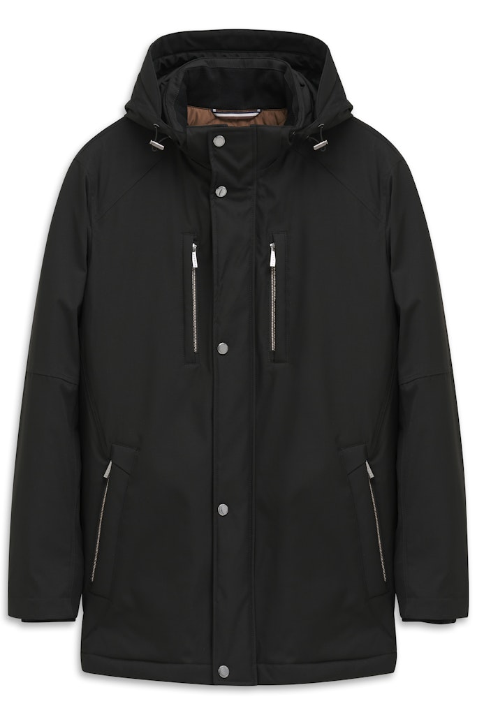 Stehkragen-Jacke mit innenliegendem Strick-Einsatz und abtrennbarer Kapuze. Zwei Brusttaschen sowie zwei schräge Leistentaschen mit Reißverschluss. Optische Teilungsnähte an Schulter, Rumpf und Ärmel. Taillentunnel im Rücken und innenliegende Ärmelstulpe. Der Style hat eine Sorona Füllung und verschweißte Nähte. Innen ein ganzes Steppfutter sowie Innentaschen. Der Artikel mit stretch-Funktion ist wasserfest (5000er Wassersäule/5000 mmH2O), windundurchlässig, atmungsaktiv und PFC frei.