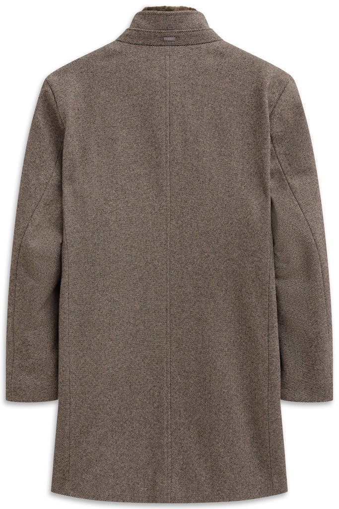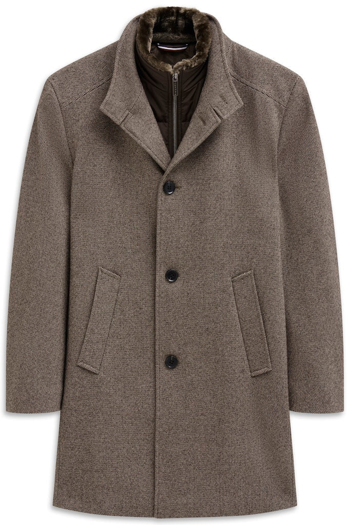 Klassischer Stehkragenmantel mit heraustrennbarem Westenfake und abtrennbarem Fellkragen-Einsatz. Schräge Leistentaschen im Rumpf. Innen ein ganzes Futter mit Flexcity Einsätzen im Rücken und Innentaschen. Der Artikel hat eine klein Dessinierung und einen angenehmen Griff.