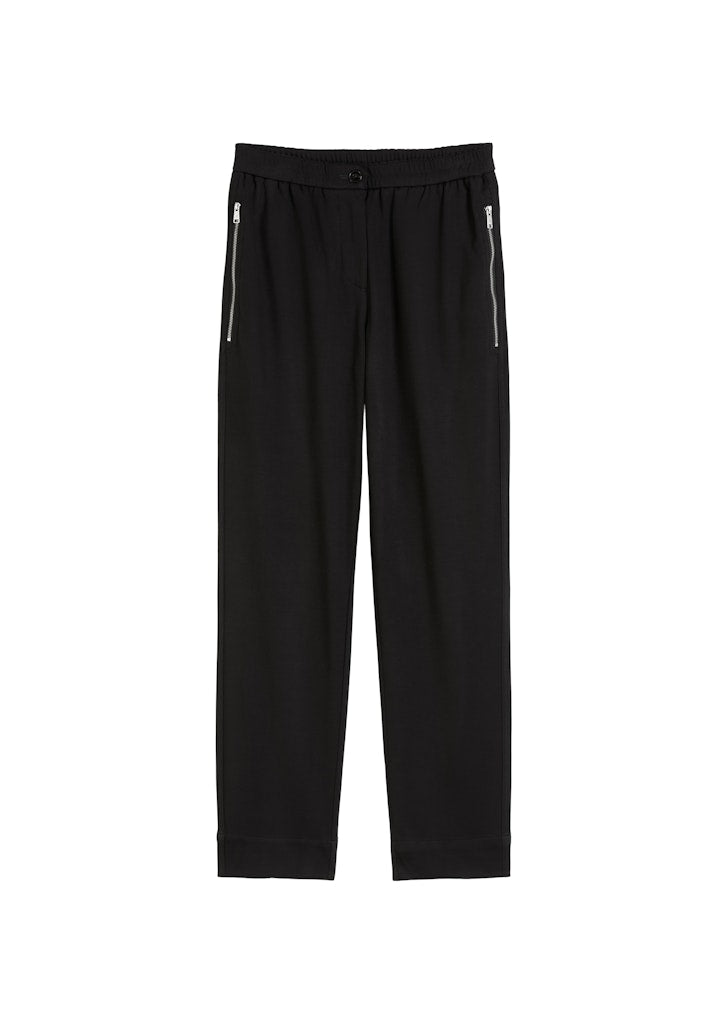 Travel in Style: stylishe und superbequeme Hose im Trackpants-Stil mit elastischem Bund und Knopf-Zipper-Verschluss. Die Hose aus einem weichen, robusten und dehnbaren Viskose-Mix in Cavalry Twill Jersey hat zwei markante Reißverschlusstaschen. Die schmal zulaufenden Beine werden von dekorativen Nähten geziert und die Säume der Hinterhose sind lässig geschlitzt. Stilvoll: zum cleanen T-Shirt und eleganten Blazer kombinieren.