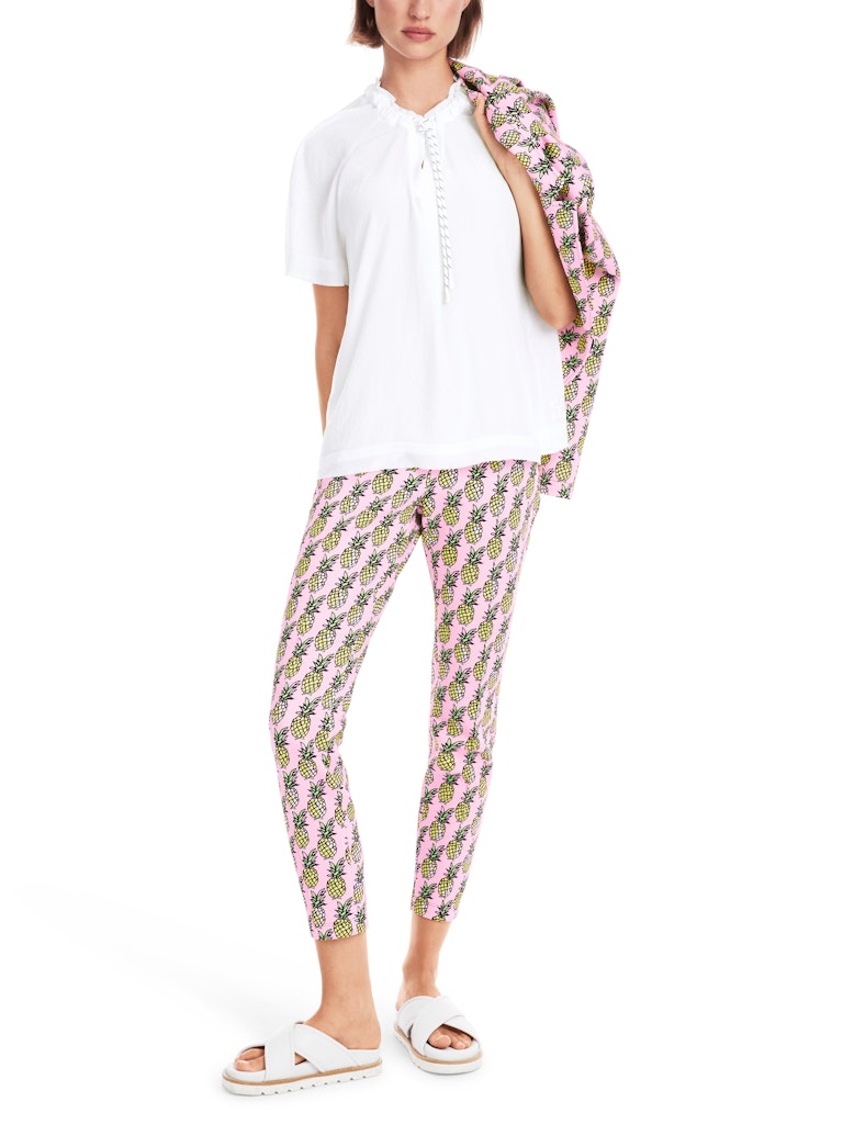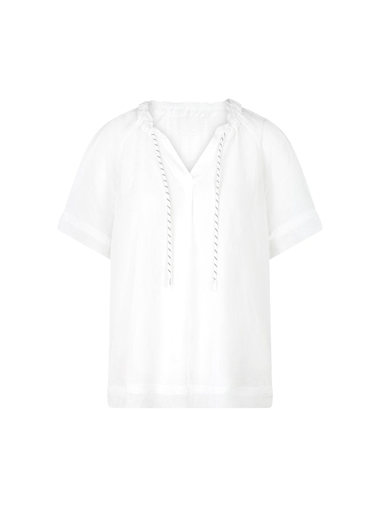 Blusenshirt in einer Kombination aus reinem Baumwollstretch im Rücken und leichtem Parachute-Material im Vorderteil. Ein sportiv lässiger Schnitt kennzeichnet den Stil dieser Bluse. Sie hat eine weite Silhouette. Die kurzen Ärmel zeigen sich in Raglanform. Der Ausschnitt kommt mit Schlitz und Kordel. Außergewöhnliche Details sind die aufgesetzten Saumstreifen im offenkantigen Design.