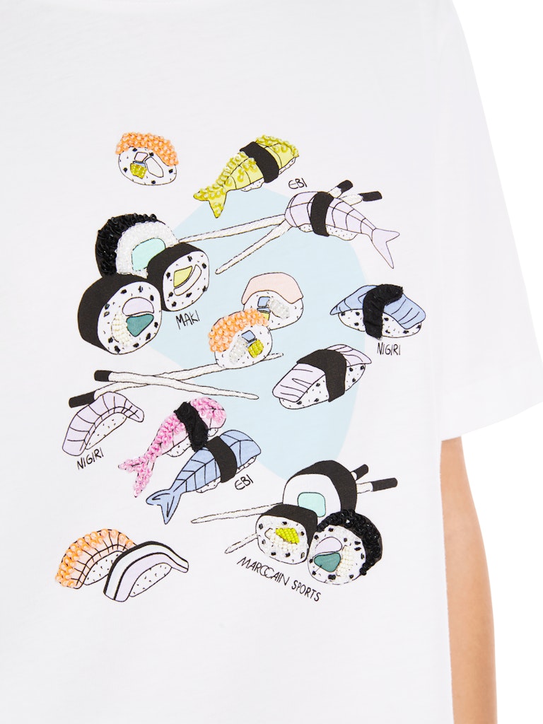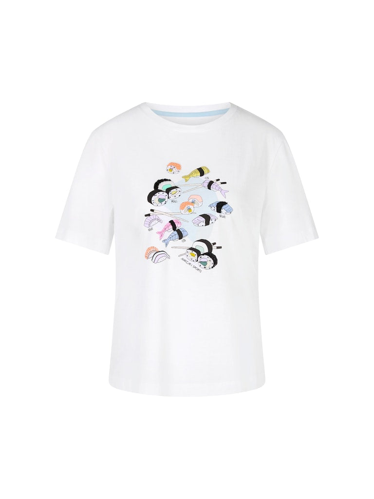 Highlight bei diesem T-Shirt ist die fröhliche Sushi-Applikation mit Perlen und Pailletten. Gleichzeitig überzeugt es mit einem lässigen Schnitt. Die Silhouette zeigt einen Rundhals sowie viertellange Ärmel. Dank der luftig-leichten Baumwolle ist dieses kühlende Shirt die perfekte Wahl für einen heißen Sommertag.