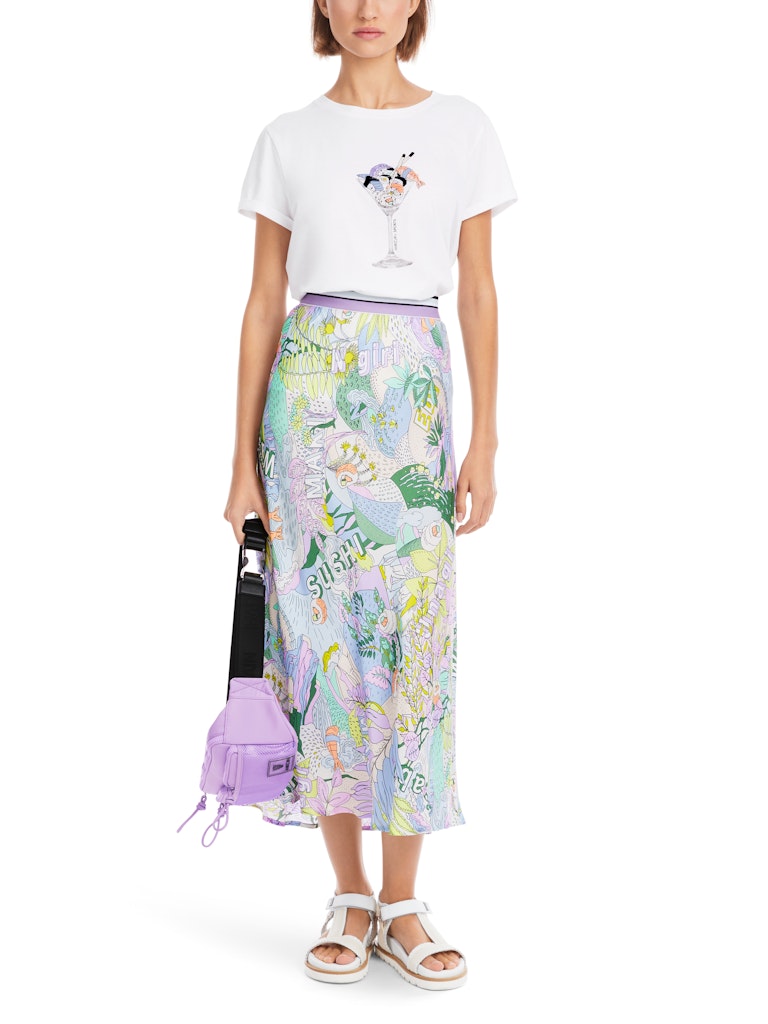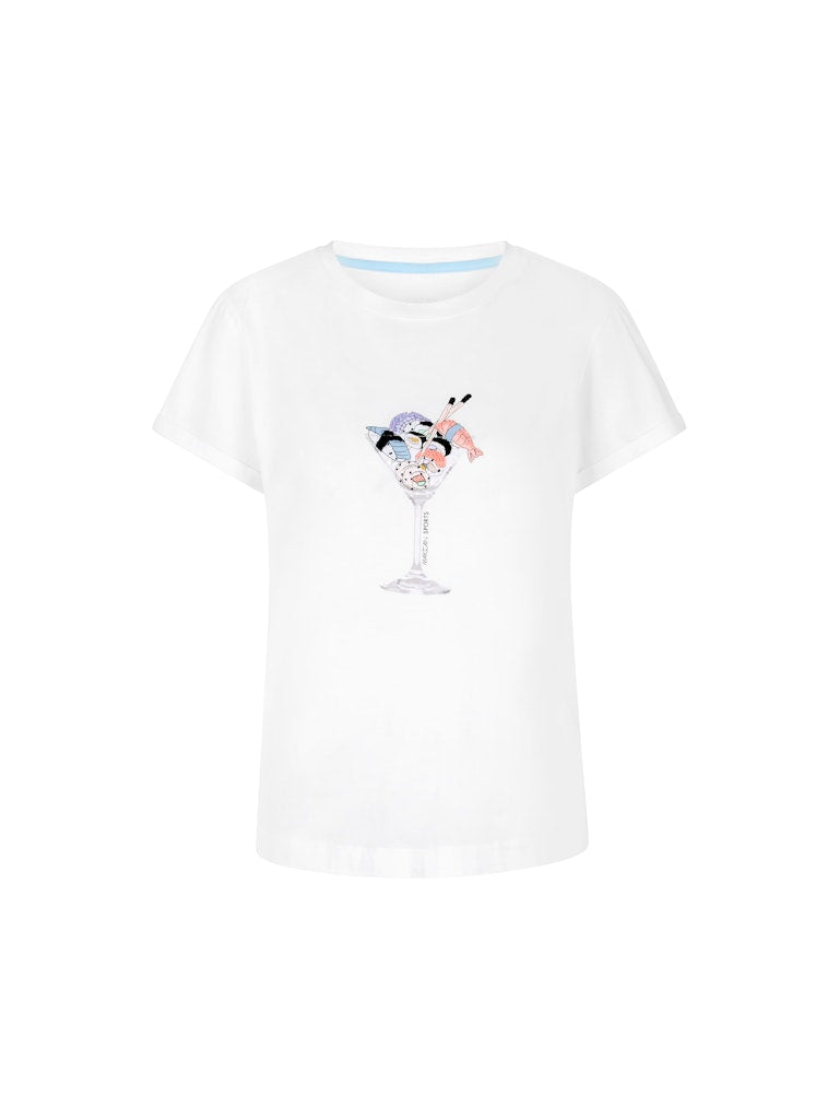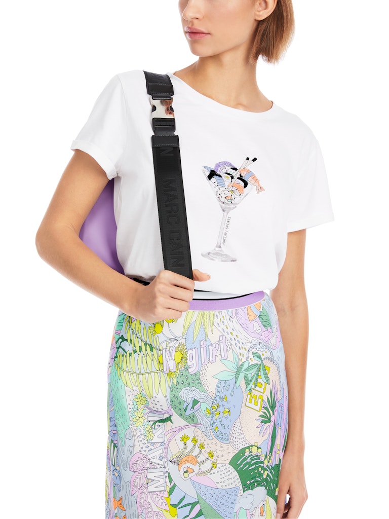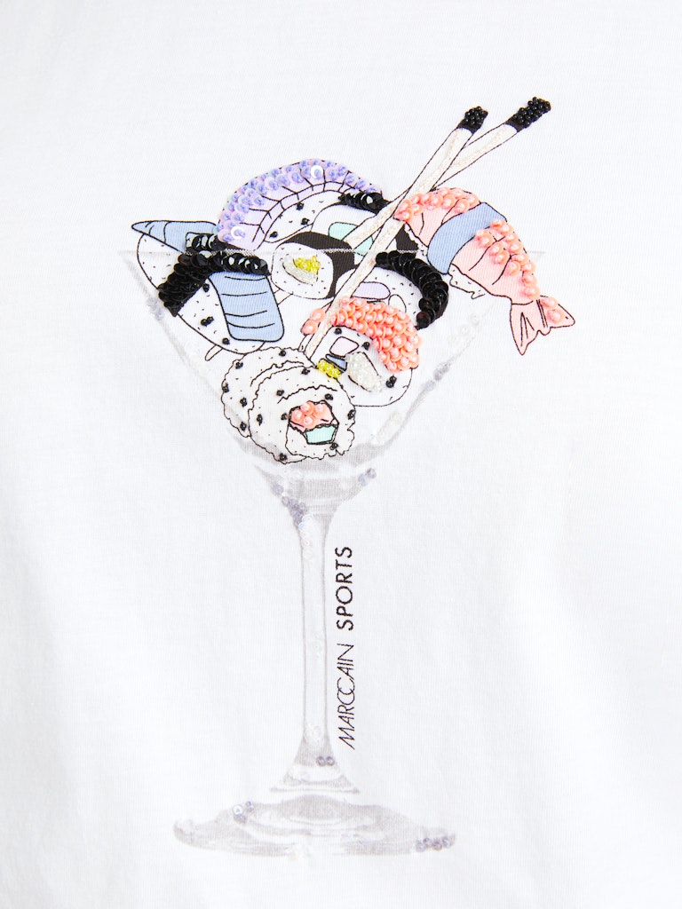 Highlight bei diesem T-Shirt ist die 3D-Sushi-Cocktail-Applikation auf dem Vorderteil. Das Shirt hat eine lockere Silhouette mit Rundhals, kleinen Seitenschlitzen und viertellangen Ärmeln. Mit seiner leichten Baumwolle passt es ideal in sommerliche Outfits.