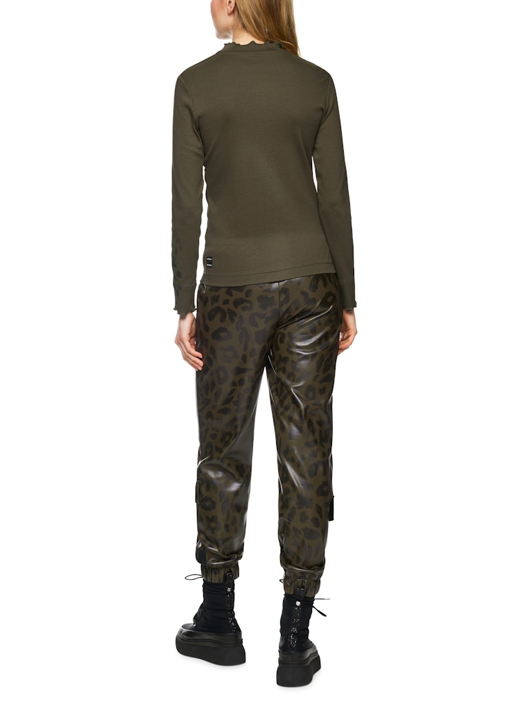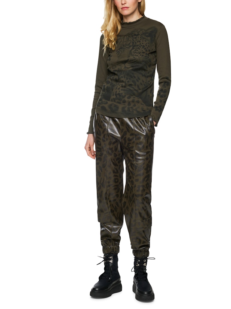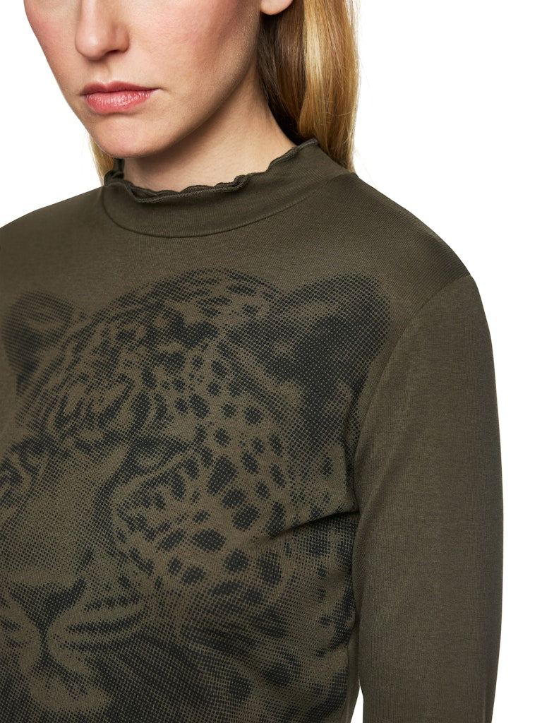 Langärmeliges Shirt aus stretchigem Baumwoll-Ripp. Das Modell hat eine schmale Form und einen leicht erhöhten Rundhals. Fancy, die Ärmel und Halsausschnitt, die mit einem gewellten Saum abschließen. Die Front und den Ärmel zieren einen Leo-Druck mit Blumen in Siebdruck-Optik.