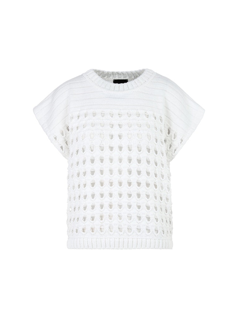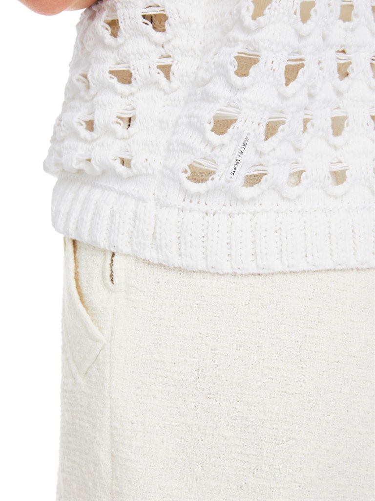 Highlight dieses weiten Crew-Neck-Pullovers ist der Strickmuster-Mix aus Ajour und Querrippen. Damit zeigt er, was Bodelshausen an Strickkunst leisten kann. Das ärmellose Modell aus angenehmem Baumwoll-Mix ist „Knitted in Germany“: Das Verstricken der Garne auf hochmodernen Strickmaschinen und die Veredelung der Stoffe geschehen am Standort Deutschland. Zusammengenäht werden die einzelnen Teile wie Ärmel, Vorderteil etc. in europäischen Partnerbetrieben.
