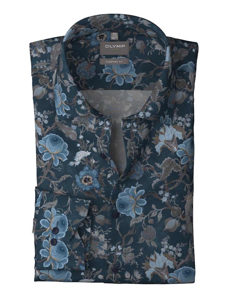 Das komfortabel geschnittene OLYMP Luxor Businesshemd präsentiert sich mit einem Blüten-Print in wechselnden Naturtönen von sanftem Grün über Blau bis zur angesagten Key-Colour Lila. Individuell und stilvoll. Gewebt aus feinen Baumwollgarnen, atmungsaktiv, hautsympathisch und bügelfrei. Vollendet mit smartem New Kent.