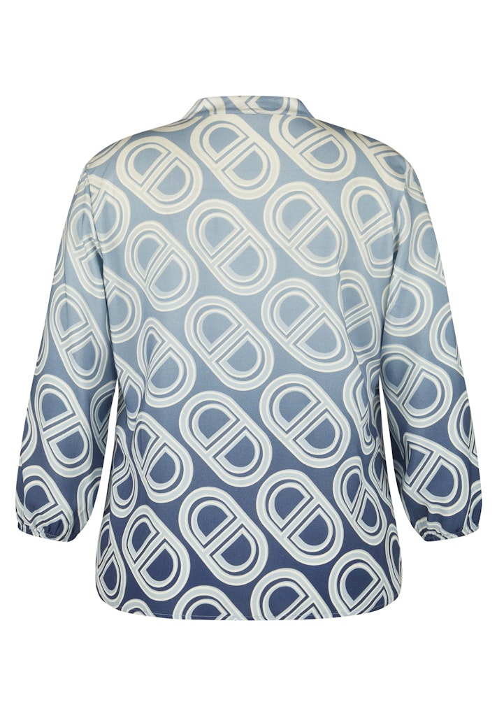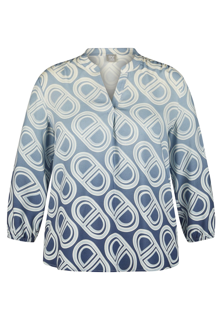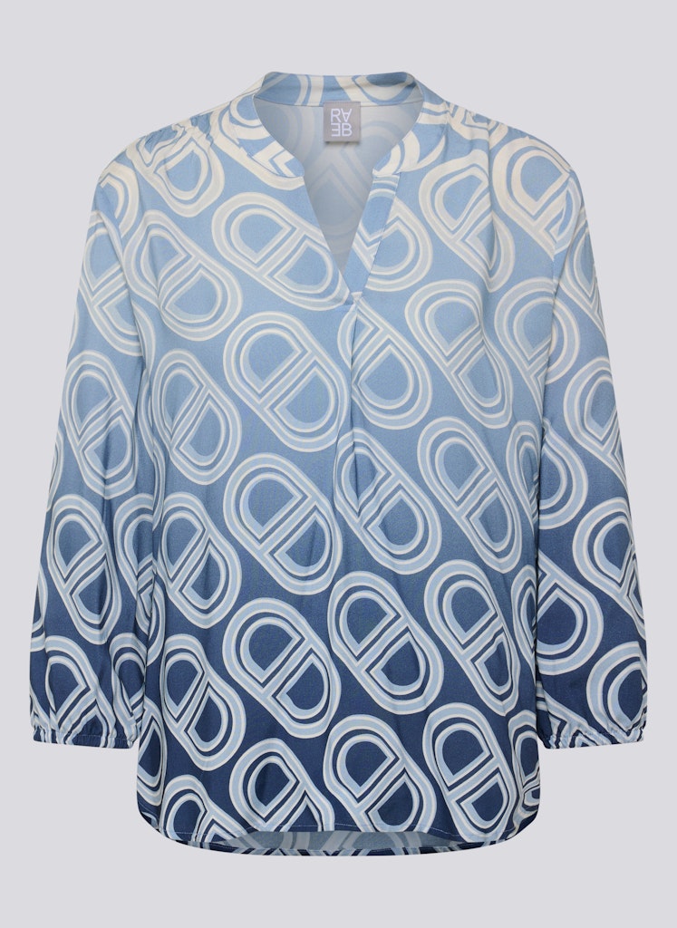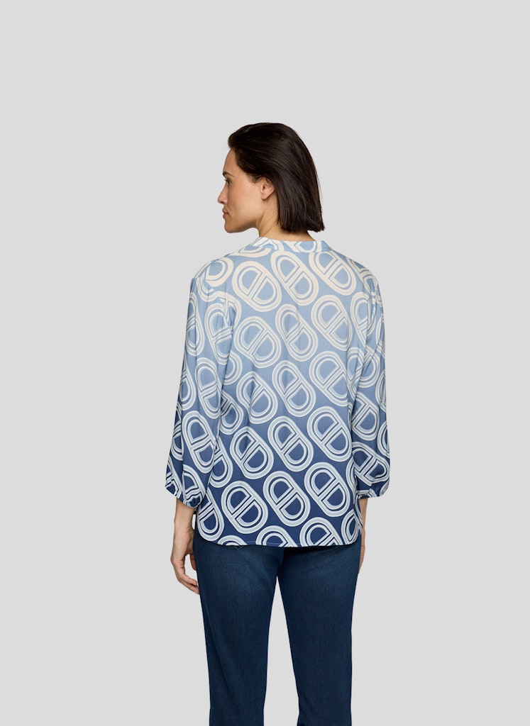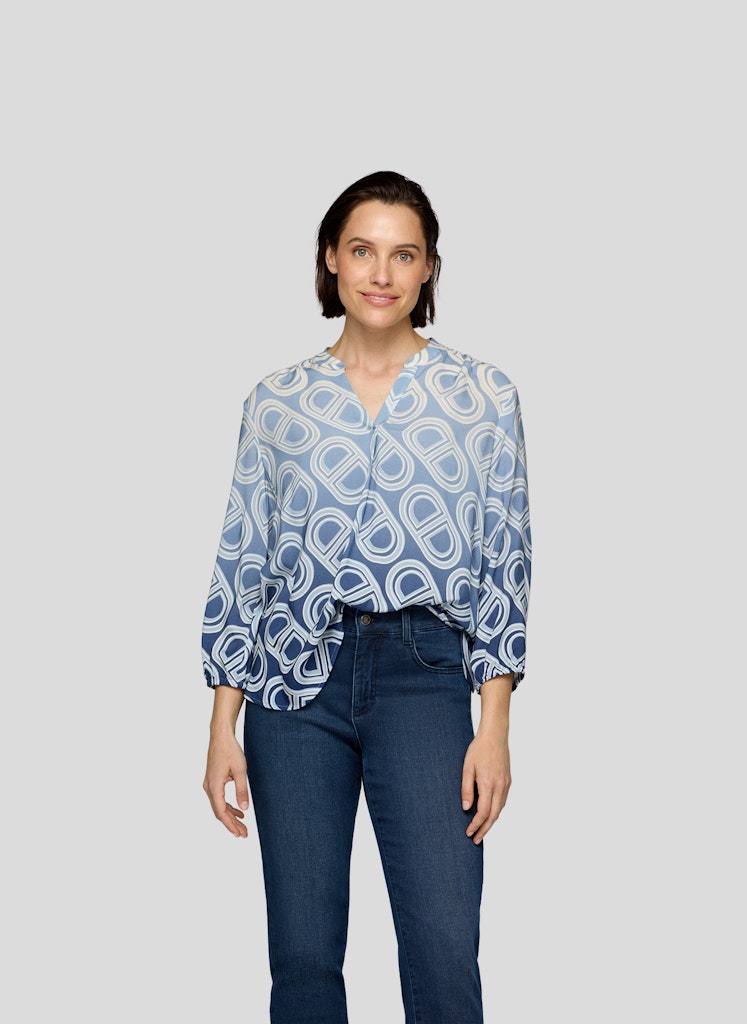 Diese Bluse begeistert mit ihrem auffälligen grafischen Muster, das jedem Outfit einen modischen Akzent verleiht. Der kleine V-Ausschnitt und die legere Passform sorgen für ein angenehmes Tragegefühl und einen lockeren Fall. Die 3/4-Ärmel mit elastischem Abschluss unterstreichen die entspannte Note der Bluse. Perfekt kombinierbar zu schlichten Hosen oder Jeans für einen stilvollen Auftritt im Alltag oder Büro.Grafischer Allover-Print.Kleiner V-Ausschnitt.3/4-Ärmel mit Gummizug.Lockere Passform.Angenehm fließende Qualität.