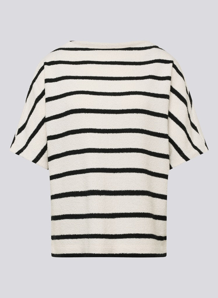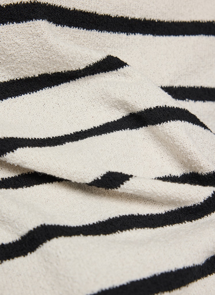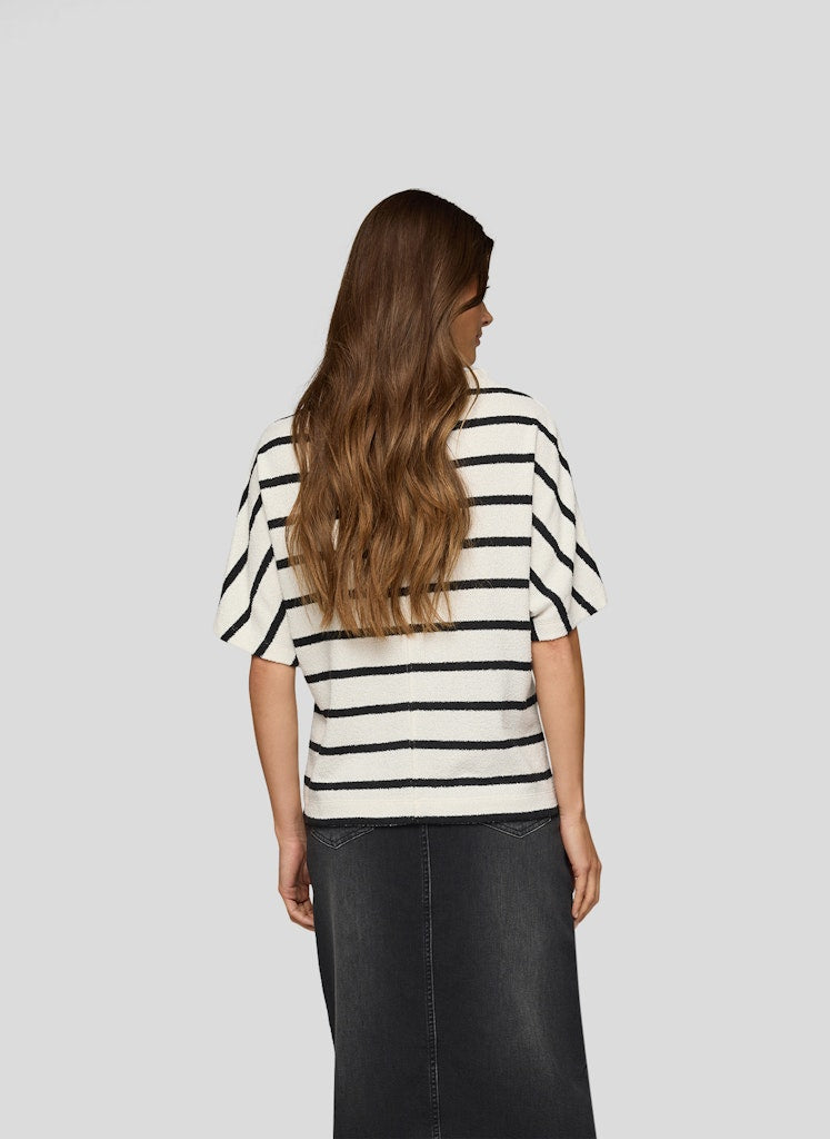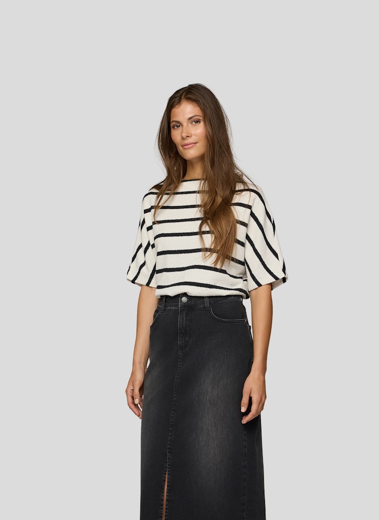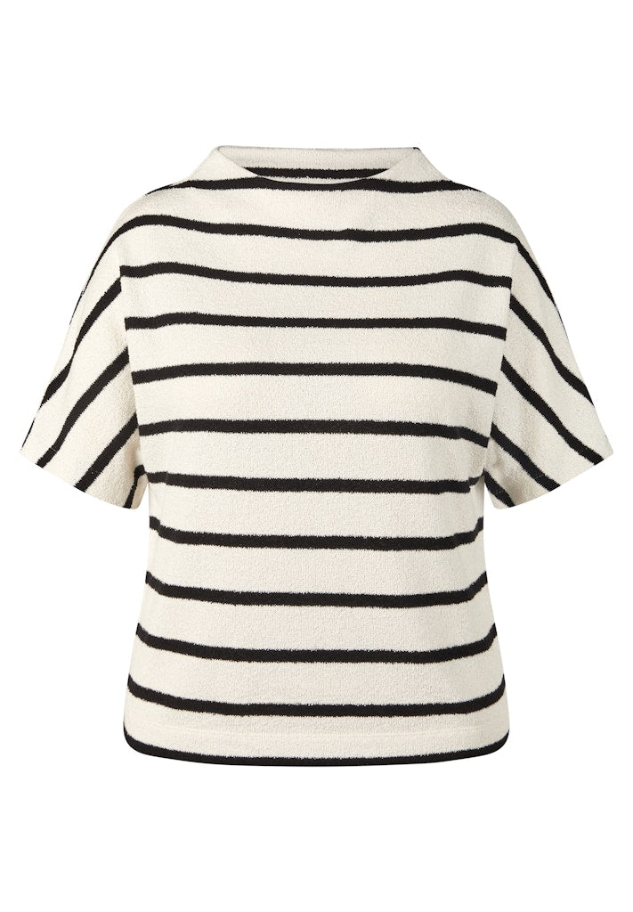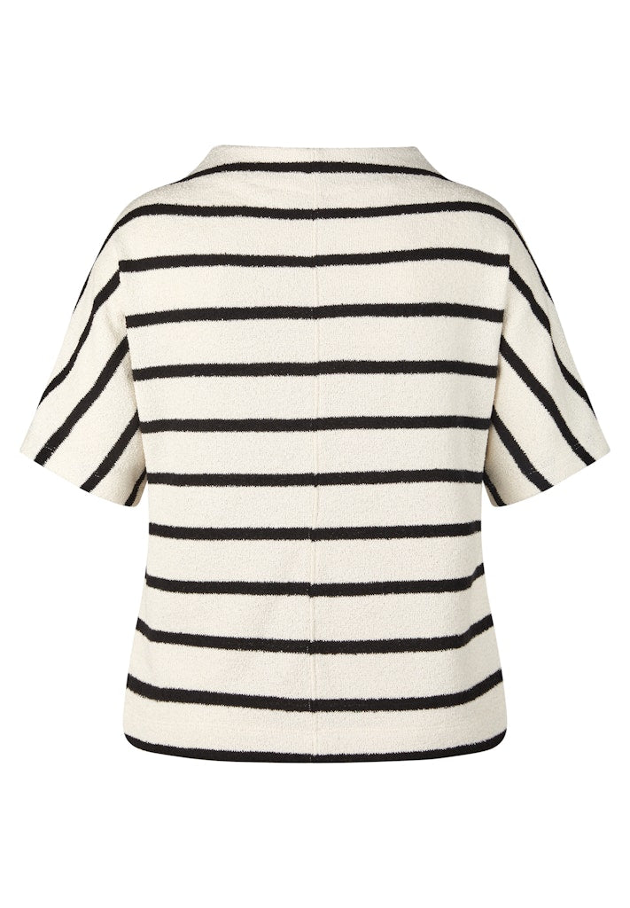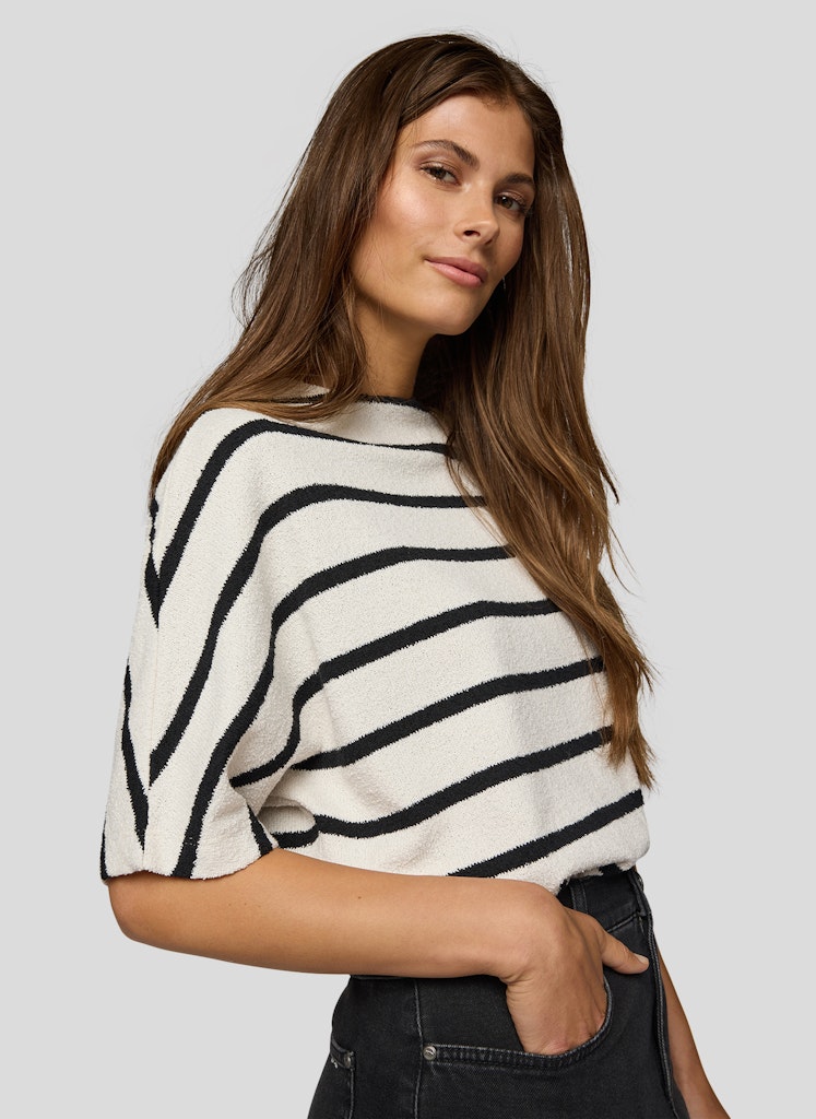Dieses Shirt bringt frischen Wind in Ihre Garderobe mit seinem klassischen Streifenmuster und dem modernen, etwas höheren Rundhalsausschnitt. Die legere Passform und der weiche, strukturierte Strick sorgen für ein angenehmes Tragegefühl und einen entspannten Look. Perfekt kombinierbar zu Jeans oder eleganten Hosen.Moderner Rundhalsausschnitt.Querstreifen-Design.Kurze Ärmel.Weiche Strukturqualität.Legerer Schnitt.