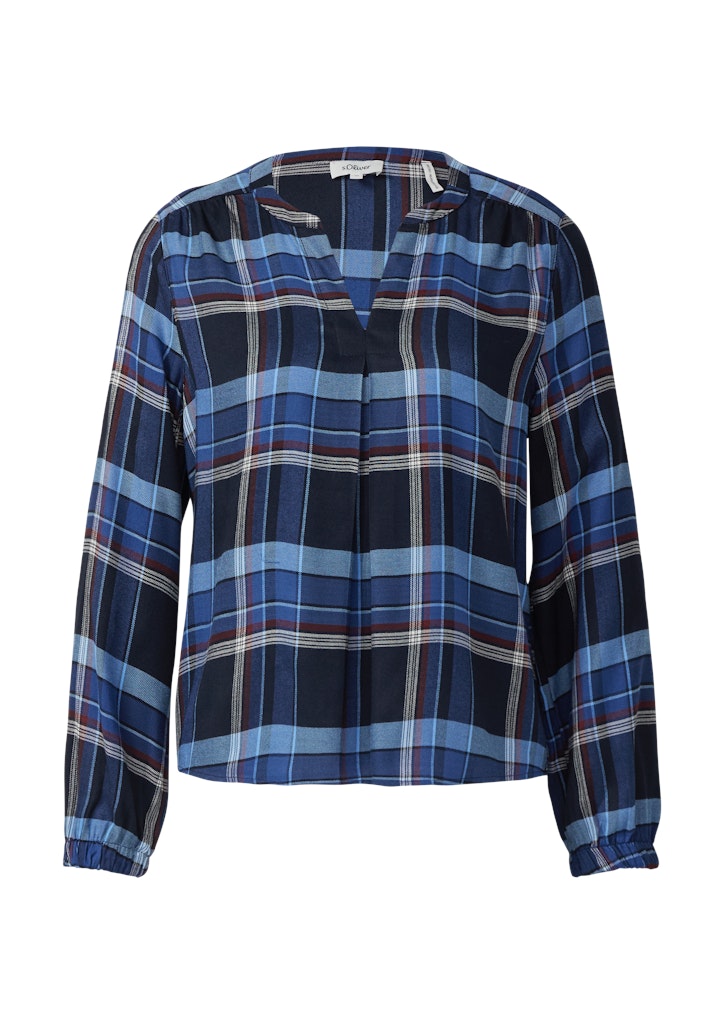 Diese karierte Bluse überzeugt mit ihrem fließenden Stoff, der sich mit dem Faltendetail und den elastischen Ärmelbündchen zu einem femininen Casual-Look vereint. Der verlängerte Rückensaum und die Kombination aus Rundhals- und V-Ausschnitt machen sie zum vielseitigen Alltagsbegleiter.