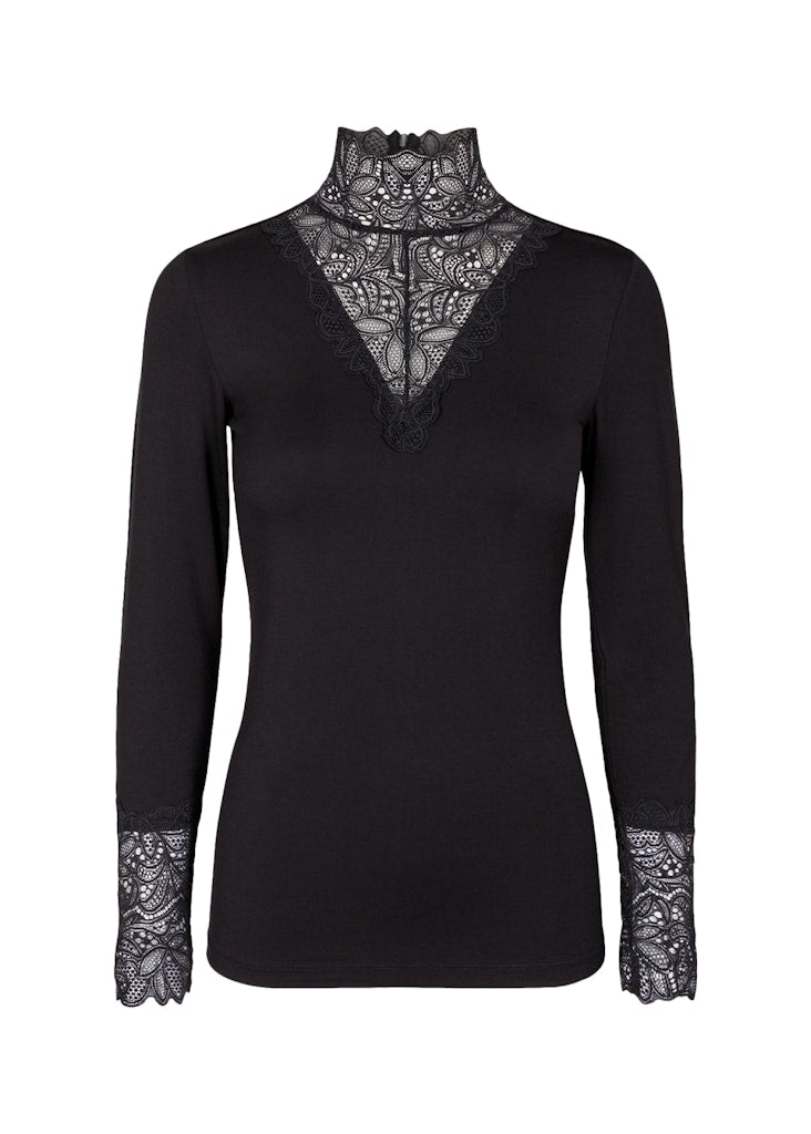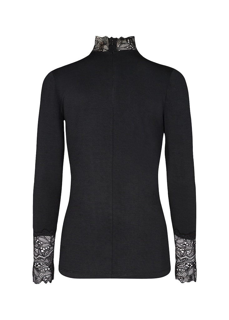 SC-Marica 20 ist ein feminines Langarm-T-Shirt in schöner Lyocell- und Elasthan-Qualität. Das langärmlige T-Shirt hat einen Spitzenkragen und Manschetten und einen V-Ausschnitt. Kombiniere es mit einem hübschen Rock oder unter einem Blazer.