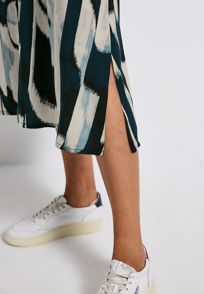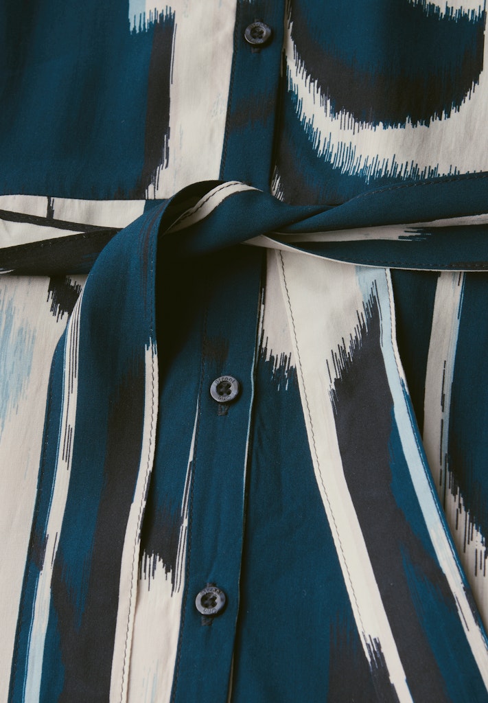 Das ärmellose Blusenkleid von Street One für Damen kombiniert einen klassischen Schnitt mit einem modernen Muster. Der weiche Viskosestoff trägt sich angenehm leicht, während Hemdkragen, Knopfleiste und der Bindegürtel eine feminine Silhouette zaubern. Praktische seitliche Taschen machen das Midikleid zu einem stylishen Alltagsfavoriten. Midi-Kleid mit grafischem Muster Hemdkragen und durchgehende Knopfleiste Seitliche Taschen Gürtel zum Taillieren Weiche Viskose Material: 100% Viskose