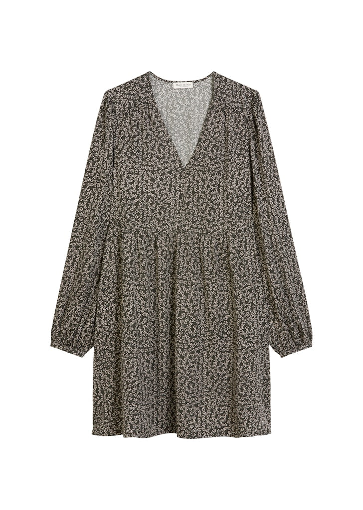 Im Trend liegen aufgeplusterte Ärmel, die noch ein wenig an Puffärmel erinnern, aber eigentlich ein viel größeres Statement sind. Edles, sportives Kleid aus feinem, fließendem Viskose-Twill mit Allover-Print in weiter, bequemer A-Form. Das kurze Modell hat einen tiefen V-Ausschnitt, eine mittige Teilungsnaht vorne und einen angesetzten, weiten, gerafften Rock. Die auffallend gerafften und in Falten gelegten Ärmel enden in schmalen Knopfmanschetten. Das Kleid ist ungefüttert. Mit blickdichten Strumpfhosen und hohen Lederstiefeln wird daraus ein lässiger Herbst-Look.