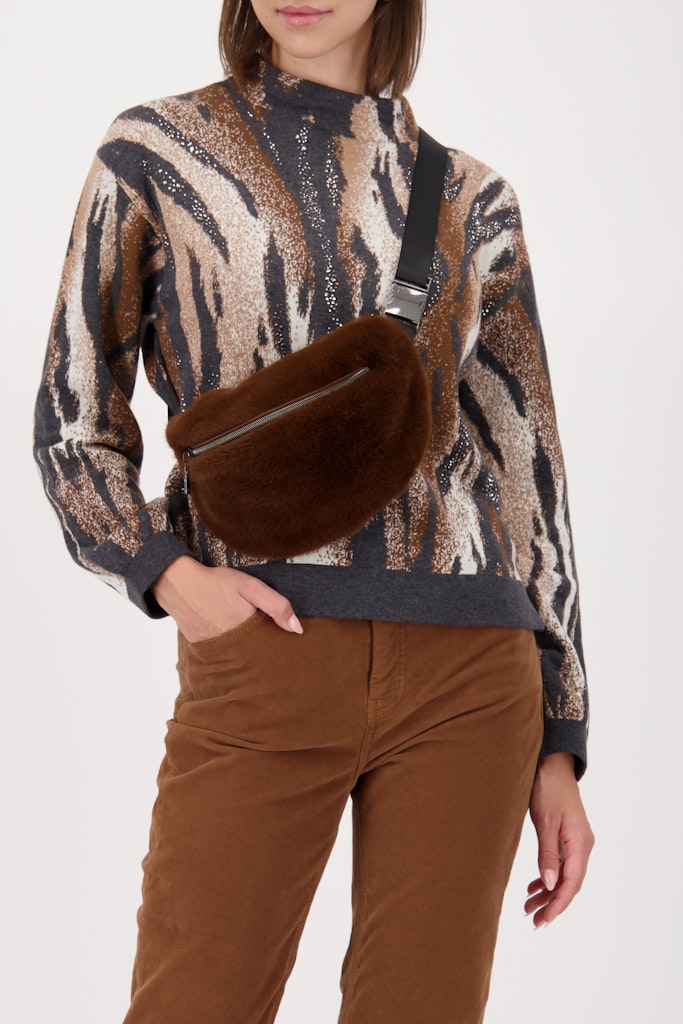 Entdecke die stilvolle Gürteltasche aus einem flauschigen Kunstfell mit einem verstellbaren Gurt und einer praktischen Innentasche.