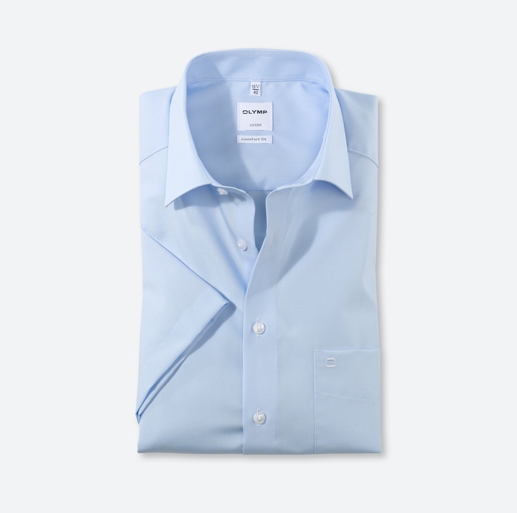 Einfach waschen, trocknen, anziehen – das Kurzarmhemd in schwarz der Linie OLYMP Luxor comfort fit mit New-Kent-Kragen bleibt auch ohne Bügeln den ganzen Tag glatt.