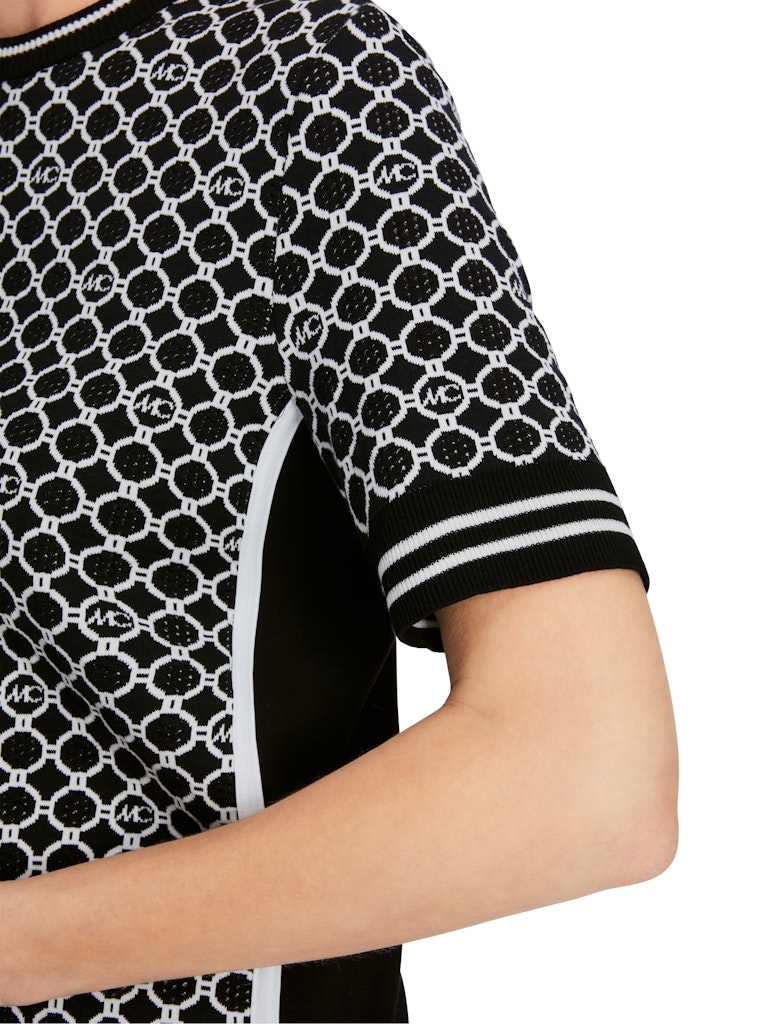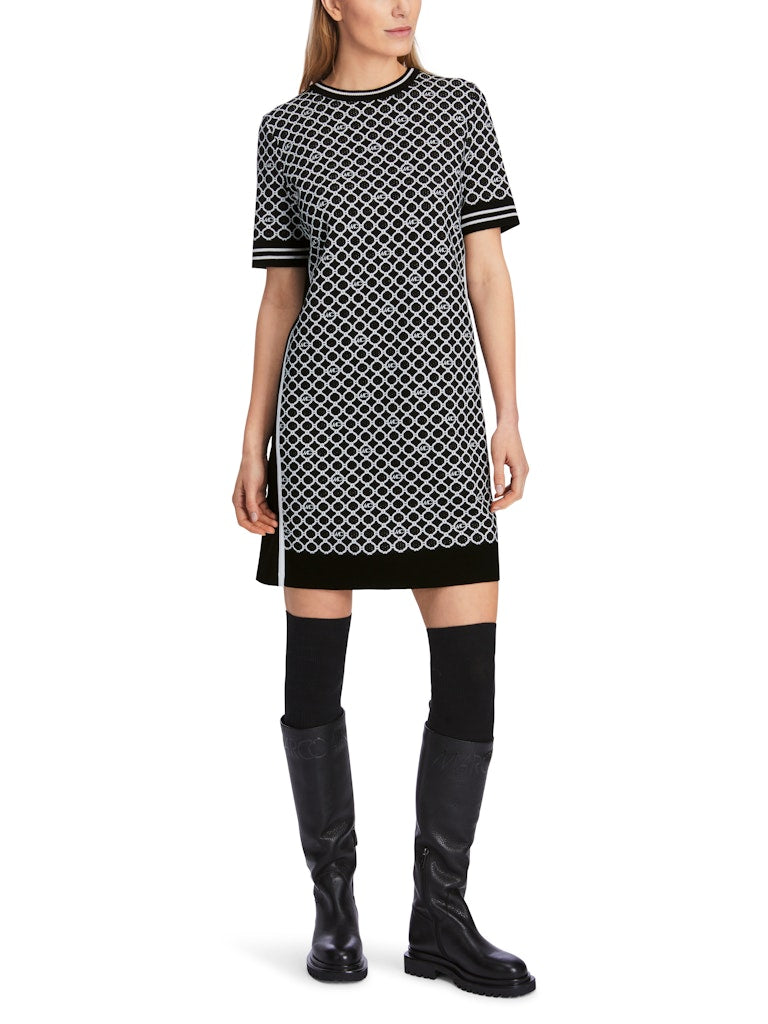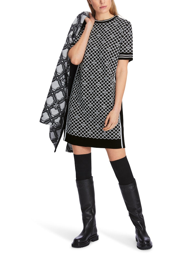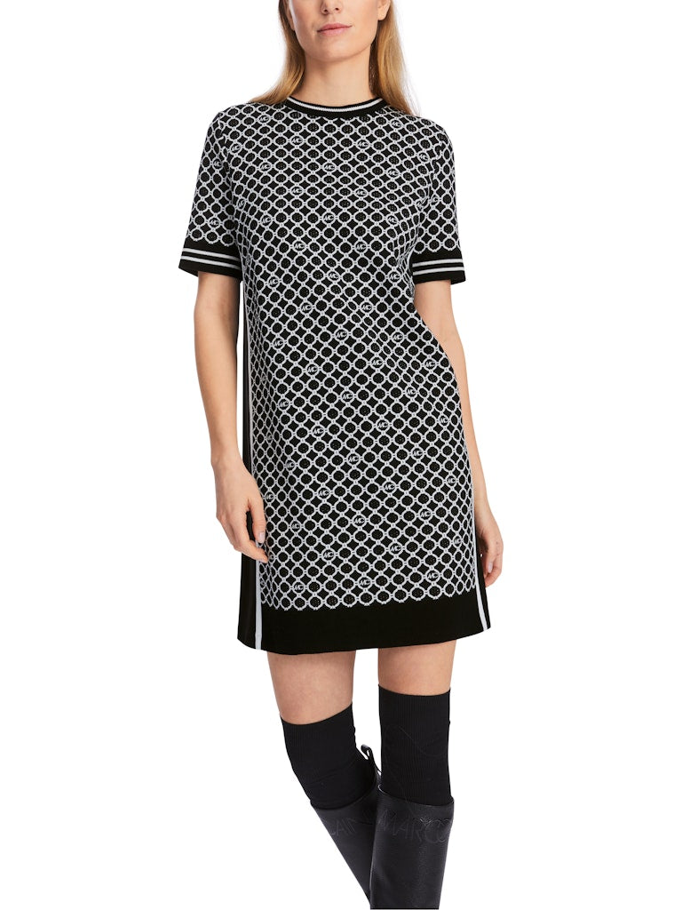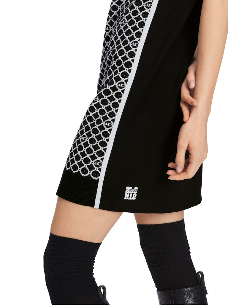 Minikleid mit dem Marc Cain Logo-Kettenprint. Vorderteil und Ärmel sind gestrickt, das Rückenteil ist einfarbig und aus Jerseystretch. Seitlich ein kontrastierender Streifen. Das Kleid wird verantwortungsvoll produziert und trägt das Nachhaltigkeitslabel Rethink Together. Zudem ist es Knitted in Germany: Es wird mit modernsten Technologien in Deutschland gestrickt und veredelt. Die einzelnen Teile - wie Rücken- und Vorderteil etc. - werden in europäischen Partnerbetrieben zusammengenäht.