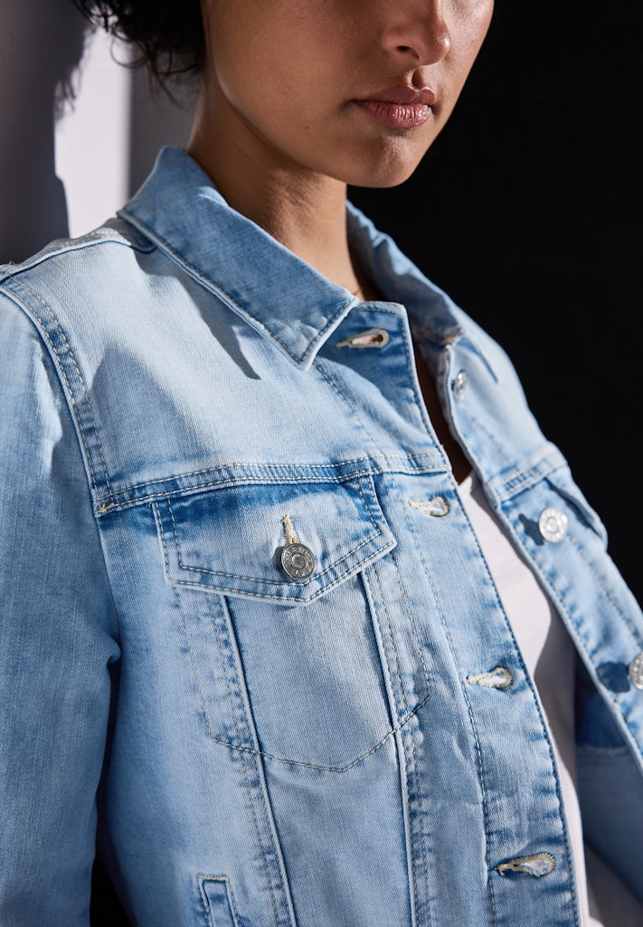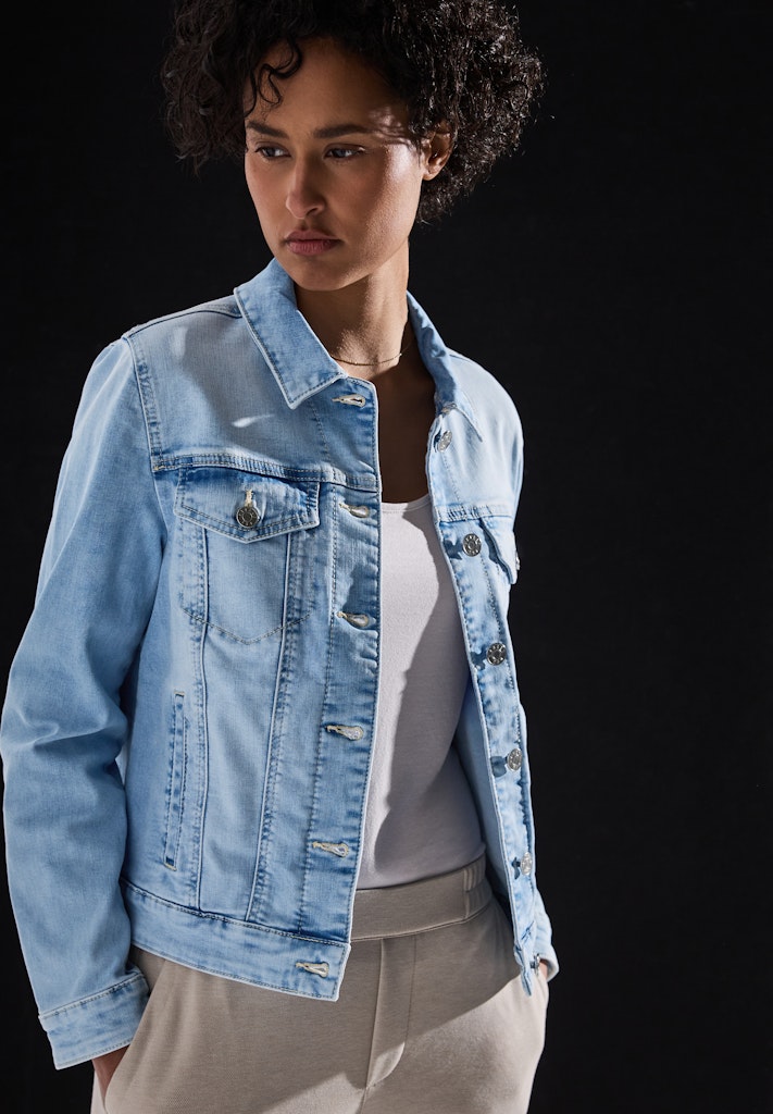 Diese angesagte Denim Jacke von Street One für Damen punktet im modischen Bleached Look und eignet sich ideal als Layering Piece zum Drüberziehen. Die Jeansjacke hat einen Hemdkragen, Brusttaschen und seitliche Taschen sowie eine Knopfleiste. Gefertigt aus einem Baumwollmix mit Stretchanteil ist die Jacke besonders angenehm zu tragen. Denim Jacke Hemdkragen Brusttaschen und seitliche Taschen Knopfleiste Baumwollmix mit Stretchanteil Material: 63% Baumwolle, 25% Polyester, 10% Viskose, 2% Elasthan