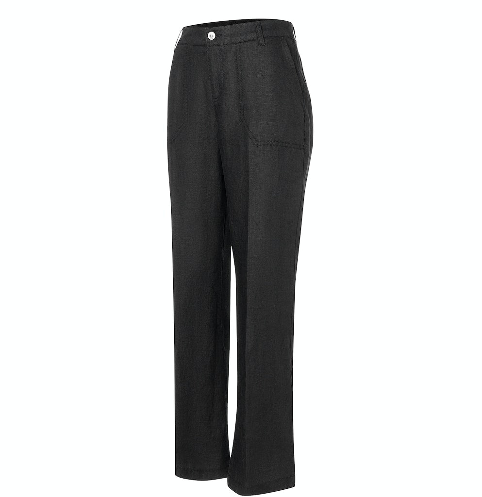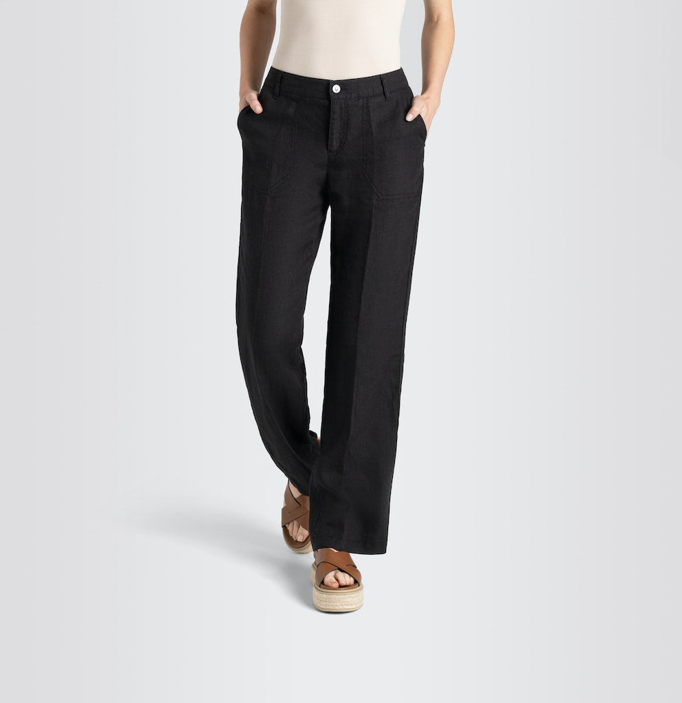Wide Fit, Wide Leg, weites, gerades Bein, mittlere Leibhöhe, bequeme Taille, seitliche Eingrifftaschen vorne, aufgesetzte Taschen hinten, Pure Linen, hochwertige, sommerliche Naturfaser-Qualität aus reinem Leinen, leicht im Gewicht, lässig-elegante Optik, temperaturausgleichend und angenehm kühl auf der Haut, hoher Tragekomfort, Das Model ist 1,75m groß und trägt die MAC Hosengröße 36, Fußweite bei Größe 36: 48cm -