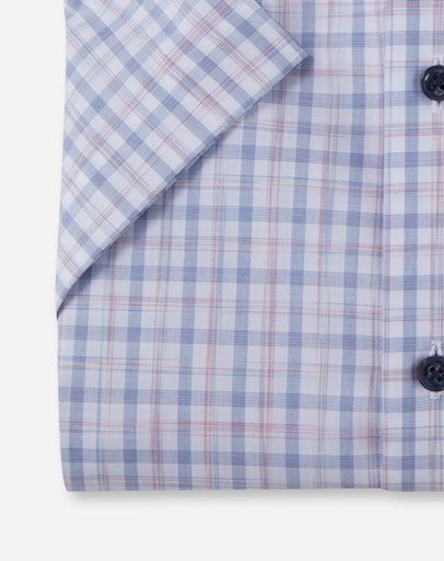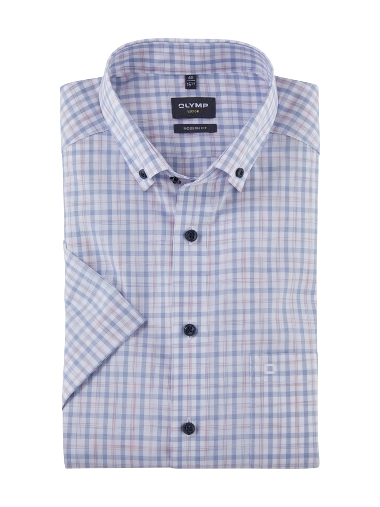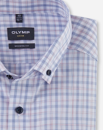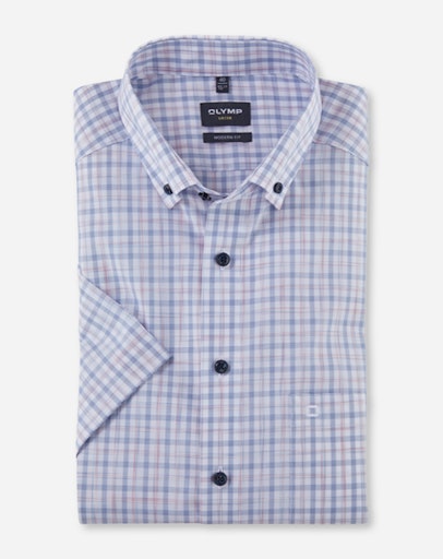 Leichtes OLYMP Luxor Kurzarm-Businesshemd in dezentem Karo-Dessin. Die feinen Garnausspinnungen aus Baumwolle sorgen für den kühl wirkenden Tragekomfort. Die Textur ist atmungsaktiv sowie zeitsparend pflege- und bügelleicht. In körpernaher Modern-Fit-Linienführung, vollendet mit sportivem Button-down-Kragen. Ohne Brusttasche.
