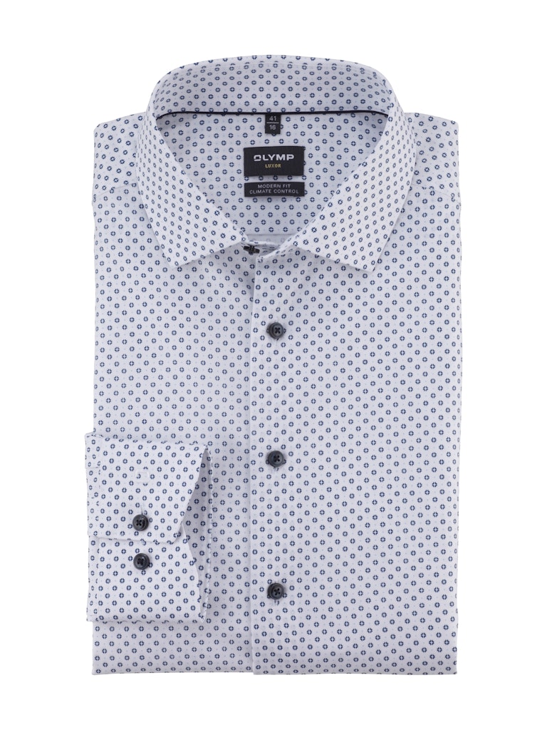 Follow the Sun. In sympathischem Minimal-Print Blau auf Weiß präsentiert sich dieses OLYMP Luxor Climate Control. Der innovative Fasermix ist pflegeleicht, atmungsaktiv, dehnbar, schnelltrocknend sowie temperatur- und feuchtigkeitsregulierend. Sportiv körpernah geschnitten, mit weltoffenem Global Kent vollendet.