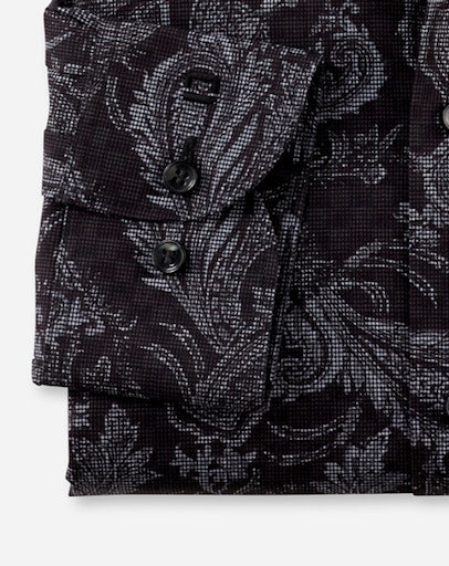 Mit diesem coolen OLYMP Level Five erhält der persönliche Business-Style neuen Drive. Was aussieht wie ein markantes Strukturgewebe, ist in Wirklichkeit eine elegante glatte Qualität mit entsprechendem Digitalprint, ergänzt durch das großformatige Ornament-Motiv. Akzentuiert durch einen modischen New York Kent. In der Grundfarbe Graphit.