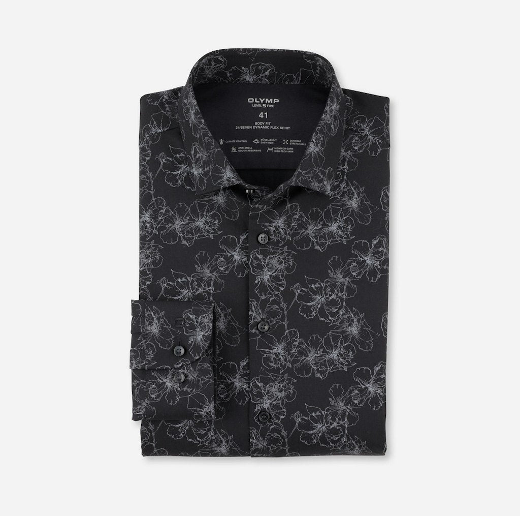 Stilvolle Floralmotive sind in der aktuellen OLYMP Frühlingskollektion ein Key-Element. Dieses OLYMP Level Five zeigt einen filigranen Rotations-Print auf Schwarz, gedruckt auf eine superfeine Dobby-Qualität. Neben der stylishen Optik besticht die hoch elastische 24/Seven-Ausstattung mit regulierendem Climate-Control-Effekt. Mit Modern-Kent-Kragen.