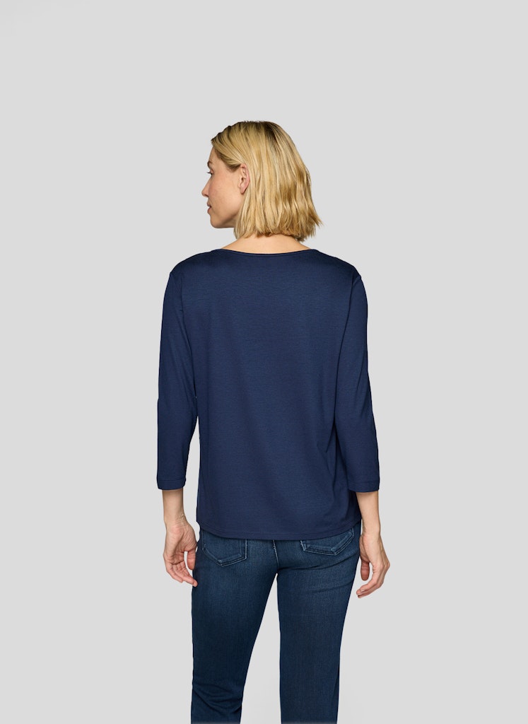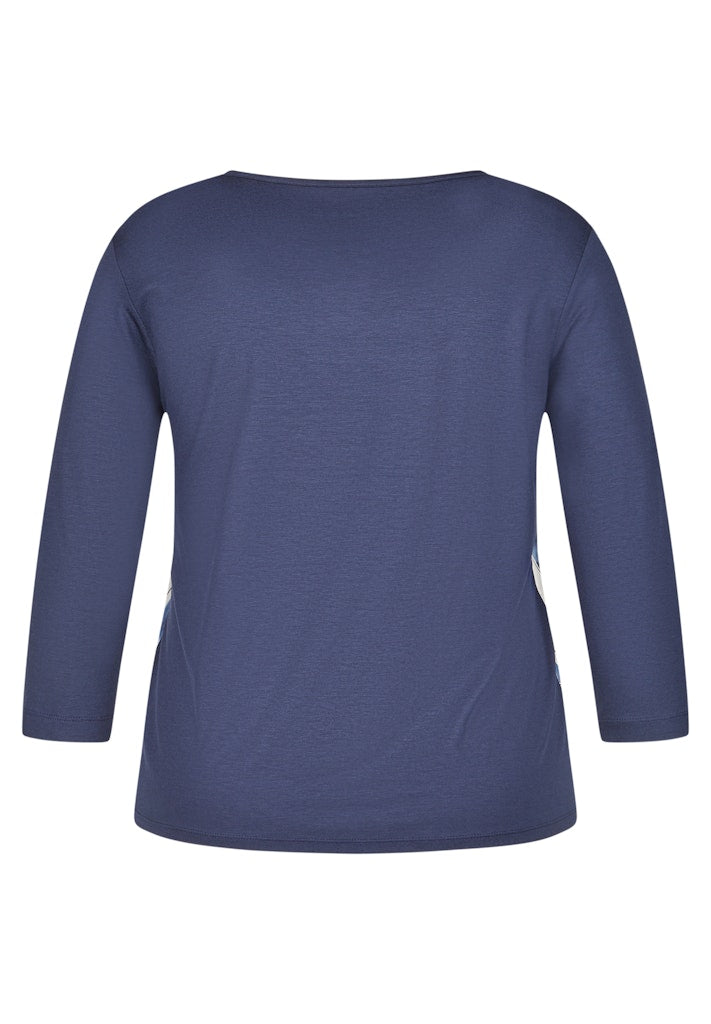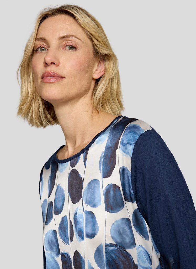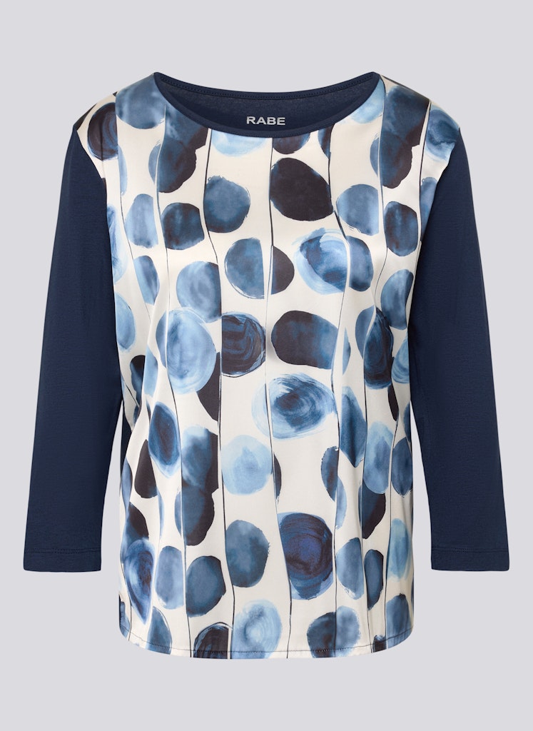 Dieses Shirt kombiniert unifarbene Ärmel mit einer Front in abstraktem Kreismuster und sorgt so für einen frischen, modischen Look. Der Rundhalsausschnitt und die ¾-Ärmel verleihen dem Shirt eine klassische Note, während das elastische Material für hohen Tragekomfort sorgt. Die leicht figurumspielende Passform macht das Shirt vielseitig einsetzbar und zum Highlight in jedem Outfit.Elastische Qualität für eine bequeme Passform.Gerade, locker fallende Silhouette.Pflegeleichtes Material.Perfekt, um schlichte Outfits effektvoll aufzupeppen.