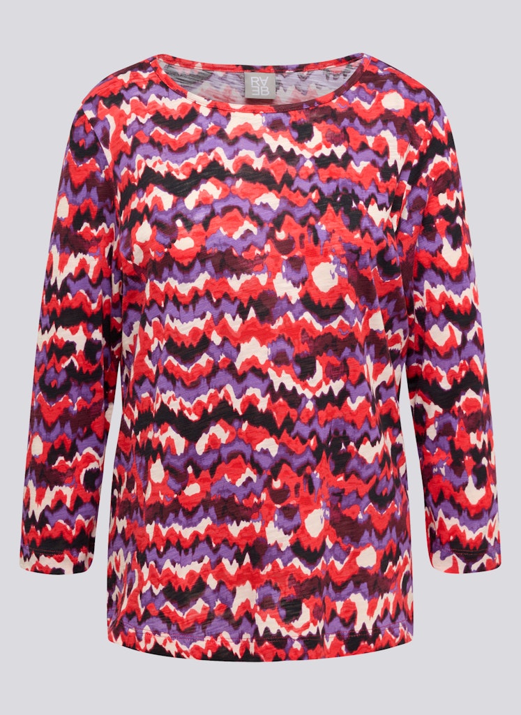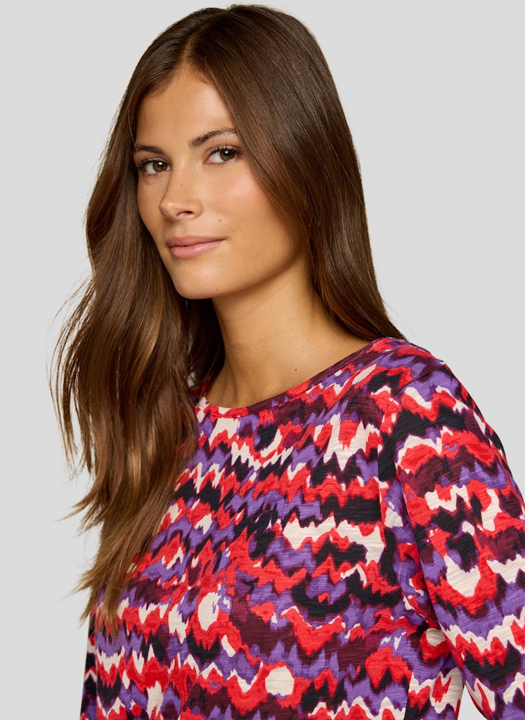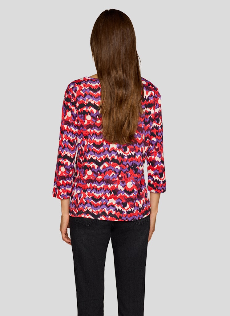 Dieses Shirt bringt Farbe in den Alltag. Das lebendige Allover-Muster sorgt für einen auffälligen Look, während der elastische Jersey angenehmen Tragekomfort bietet. Ein perfekter Kombipartner für schlichte Hosen oder Röcke.Rundhalsausschnitt.3/4-Ärmel.Farbintensives Allover-Dessin.Leicht taillierte Passform.Elastischer Jersey für angenehmen Sitz.
