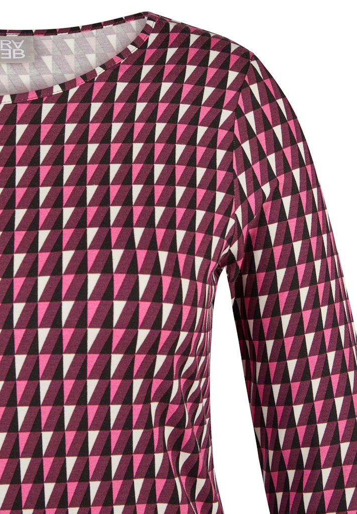 Das auffällige Allover-Muster in grafischer Optik verleiht diesem Shirt einen modernen Look. Die strukturierte Ware mit Stretch-Anteil sorgt für ein angenehmes Tragegefühl und einen formstabilen Sitz. Mit klassischem Rundhalsausschnitt und 3/4-langen Ärmeln eignet sich das Modell ideal für abwechslungsreiche Alltags-Outfits. Grafisches Allover-Muster. 3/4-lange Ärmel. Rundhalsausschnitt.