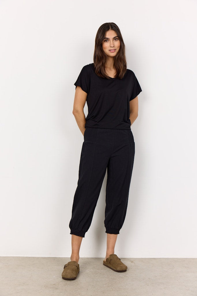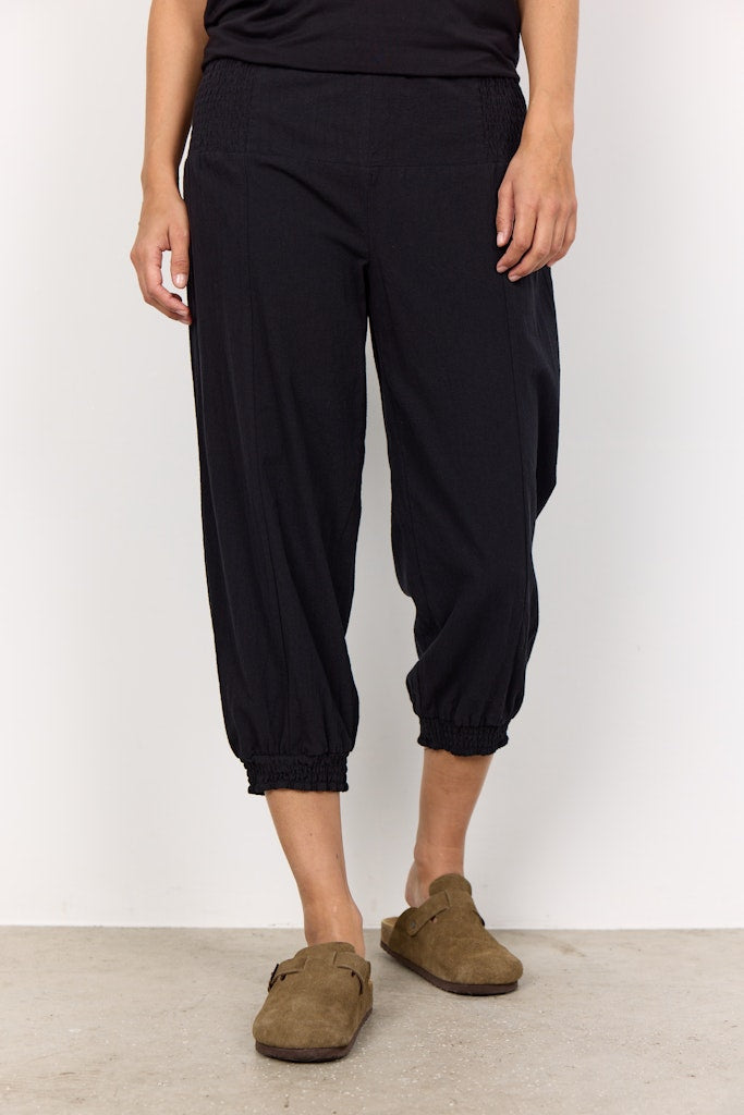 SC-Cissie 47-b ist eine coole Hose aus 100 % Baumwolle. Sie hat Faltendetails an der Hüfte, eine verkürzte Beinlänge und einen elastischen, gerafften Saum unten. Du kannst diese Hose mit einem einfachen T-Shirt und einem Paar Turnschuhen für einen schönen Alltagslook stylen.