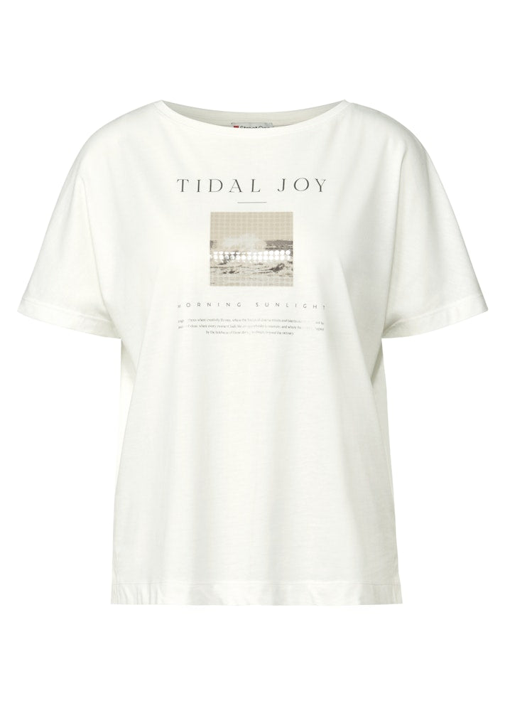 Mit seinem glänzenden Fotoprint zieht dieses T-Shirt von Street One für Damen alle Blicke auf sich. Der softe Baumwoll-Modalmix sorgt für ein angenehmes Tragegefühl, während Dropped Shoulders und Rundhalsausschnitt den Look lässig abrunden. Ideal für entspannte Styles mit Eyecatcher-Garantie. Shirt Rundhalsausschnitt Dropped Shoulders Glänzendes Artwork Softer Baumwoll-Modalmix Material: 50% Baumwolle, 50% Modal