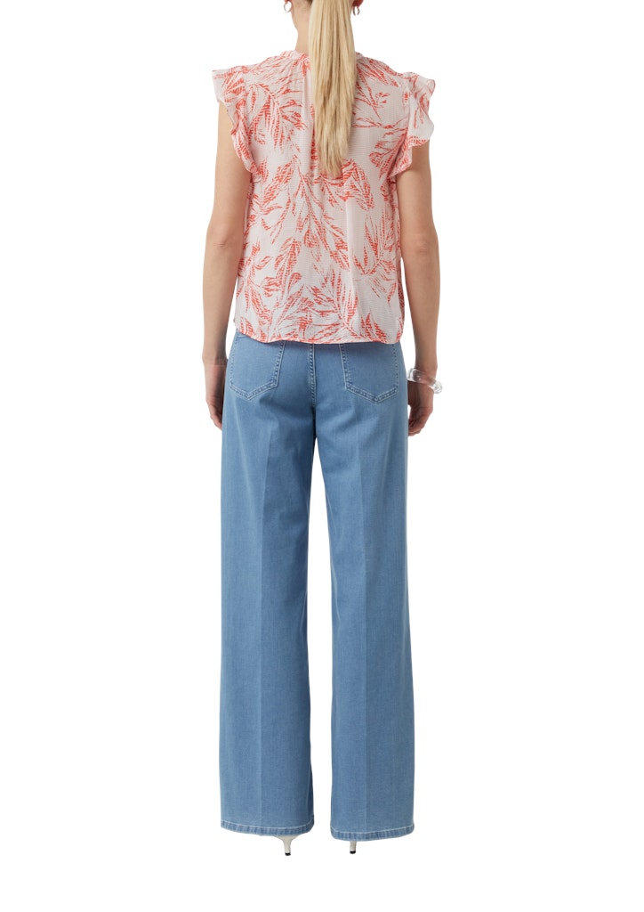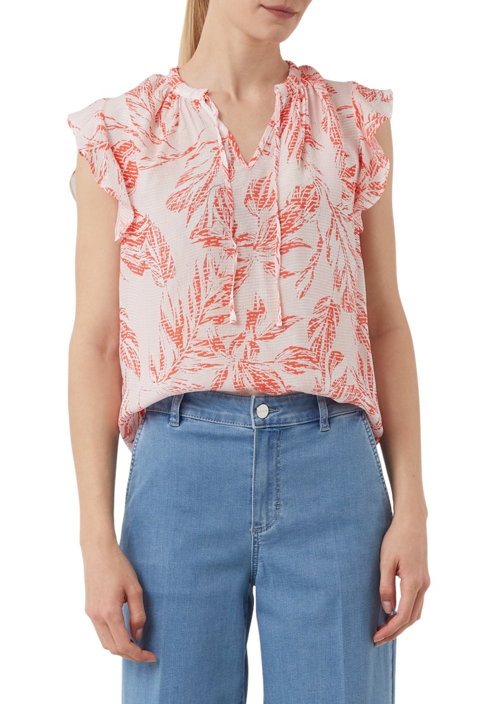 Strukturierte Raffinesse: Die ärmellose Bluse mit Volantärmeln und Crew Neck-Ausschnitt besticht durch ihr allover Muster. Der Schlitz am Ausschnitt verleiht dem Piece eine feminine Note. Kombinieren Sie diese Bluse vielseitig – vom Business-Look bis zum eleganten Abend-Outfit. Ihre strukturierte Oberfläche sorgt für subtile Textur und zeitlose Eleganz.