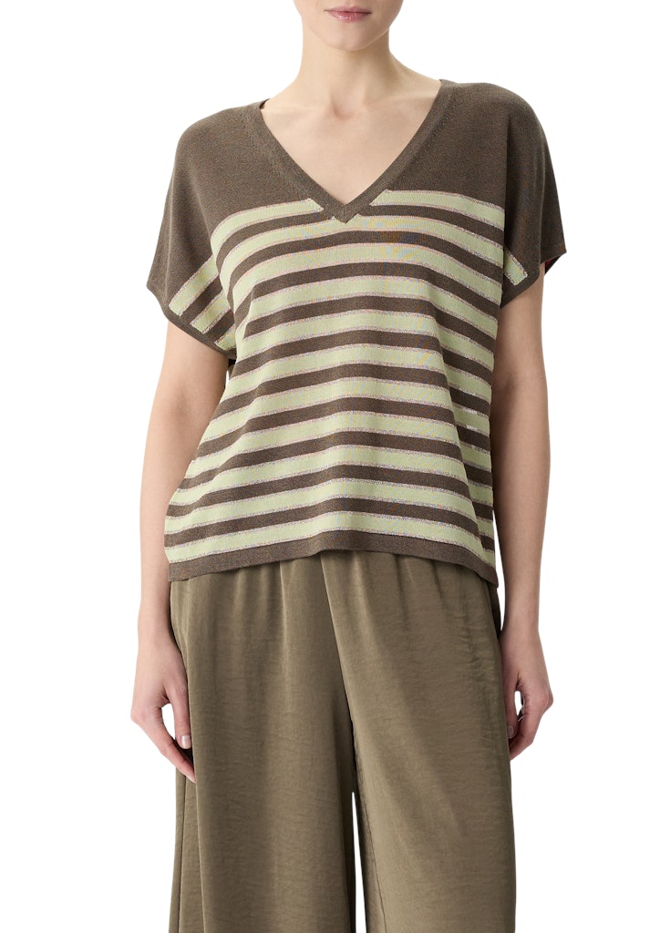 Luftig-leichter Chic: Dieser kurz ärmelige Strickpullover im Relaxed Fit verzaubert mit seinem gestreiften Design und Glitzergarn-Details. Der V-Ausschnitt und überschnittene Schultern verleihen Ihrem Look eine lässige Note. Aus einem leichten, elastischen Lyocellmix gefertigt, bietet er Ihnen luftigen Tragekomfort. Stylen Sie ihn mit einer Jeans für einen entspannten Alltags-Look oder mit einem Rock für einen eleganten Auftritt.