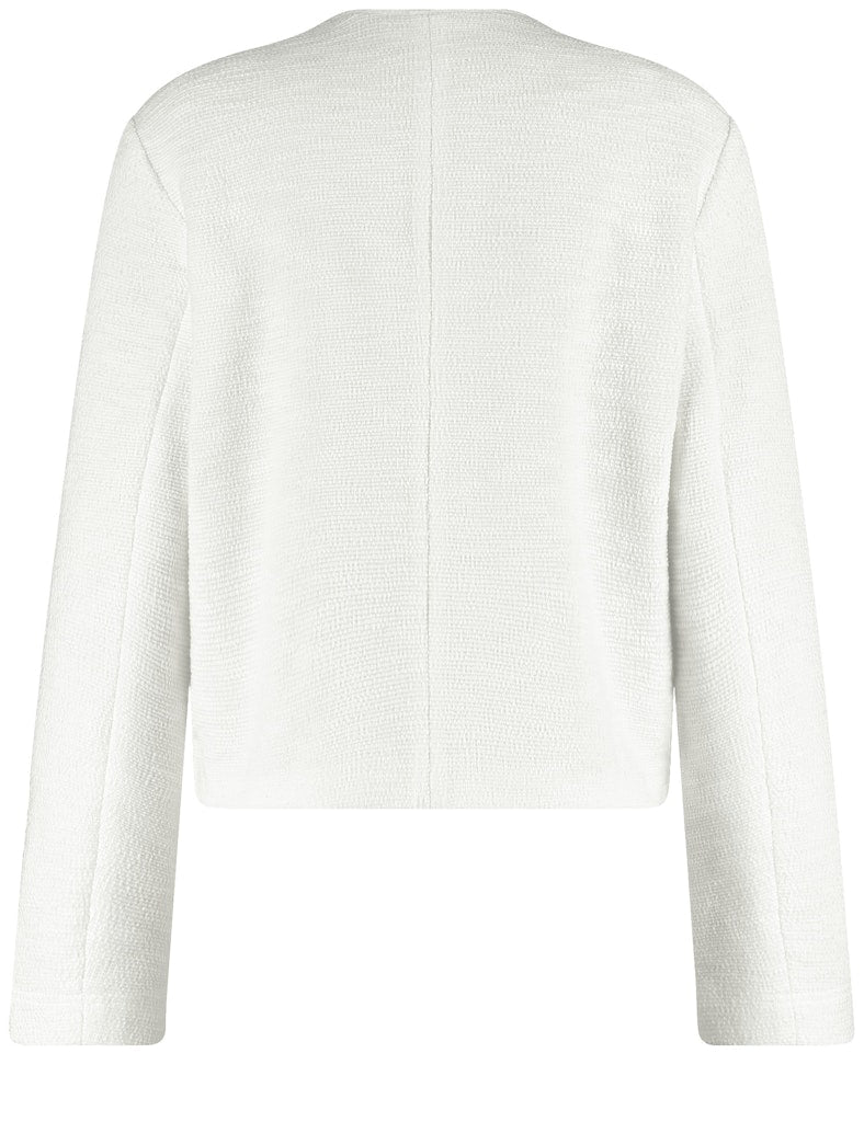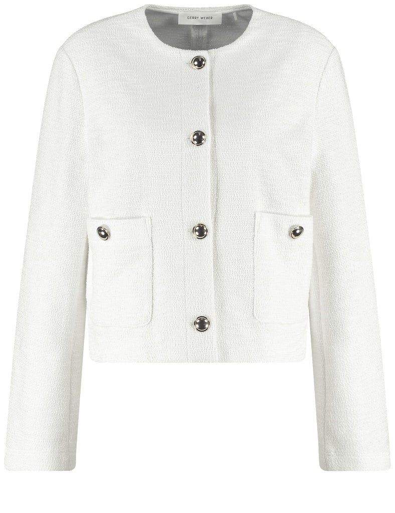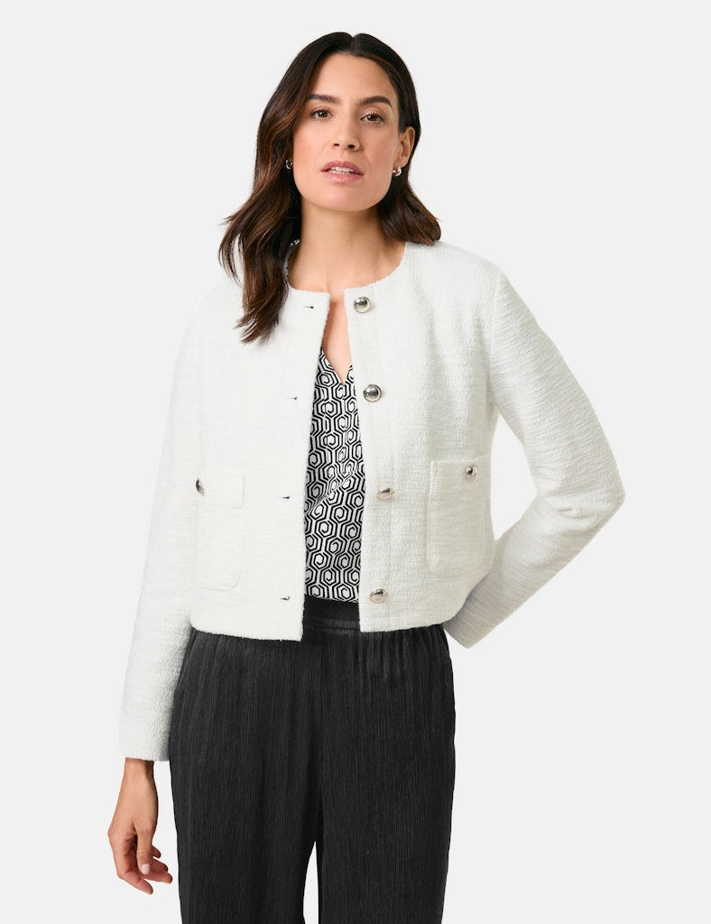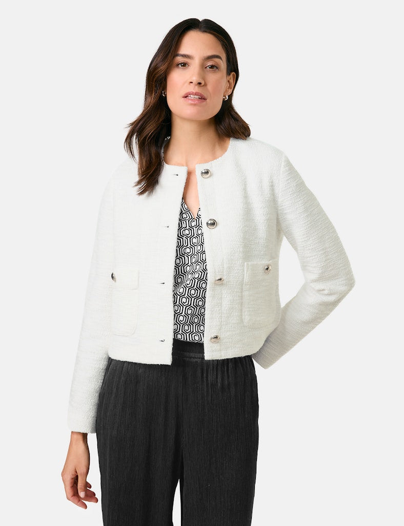Teilungsnaht am Rückenteil. Glänzende Schmuckknöpfe. Ein stilvoller Begleiter für jeden Anlass: Diese elegante Blazerjacke aus softem Bouclé-Jersey überzeugt mit hohem Tragekomfort und dezentem Stretch. Glänzende Schmuckknöpfe setzen edle Akzente, während aufgesetzte Taschen eine lässige Note verleihen. Ob mit Jeans für einen modernen Look oder mit der materialgleichen Hose für klassische Eleganz – dieses vielseitige It-Piece rundet jedes Outfit perfekt ab.